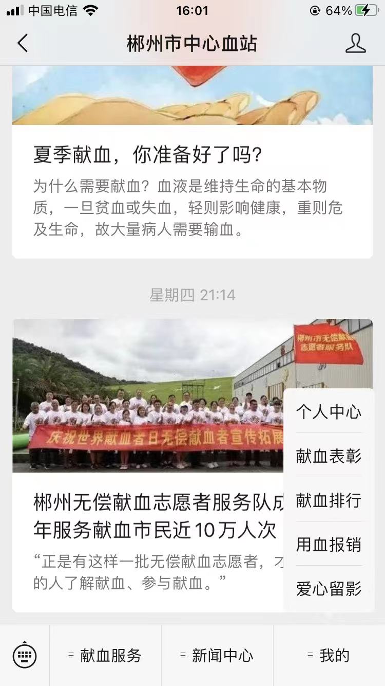 今年7月,为进一步提升献血服务水平,使异地用血的献血者报销更方便快捷,郴州市中心血站微信公众号网上直报工作已开启,也就是说,对符合血费报销条件的献血者及其受益人,将享受“零跑腿”实现网上血费返还,只要打开手机,动动手指就能完成一切。