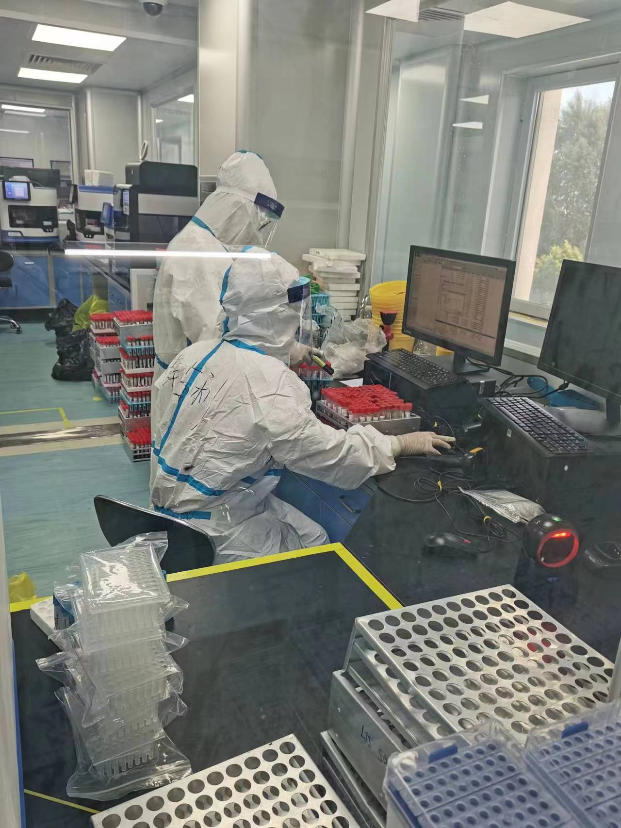 检测区的医生需要直接面对采集标本,厚重的防护服就成了他们“作战的盔甲”,为了不耽误进度,保质、保速完成检验工作,他们不敢吃饭、喝水,尽可能减少出去次数,把时间都留在工作上,闷热的防护服使“全副武装”的检验人员常常汗流浃背,脸颊也被口罩勒出红痕,可是他们从未有过一句抱怨。一批又一批的标本源源不断地送往实验室,谁也不愿意拖工作的后腿,力争保质、保量完成工作,显然,所有人已经忽视了时间的存在。