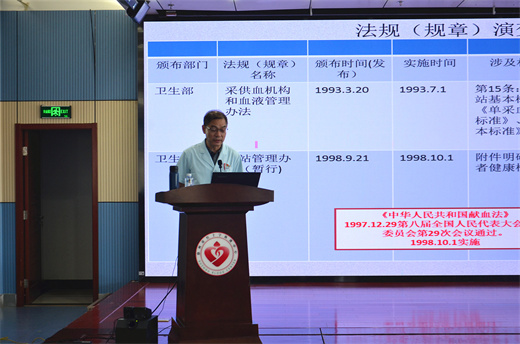 为进一步贯彻“一法两规”,提高依法执业意识,9月7日下午,徐州市血液中心举办《血站管理办法》全员培训,质量管理科科长王照军进行专题授课。