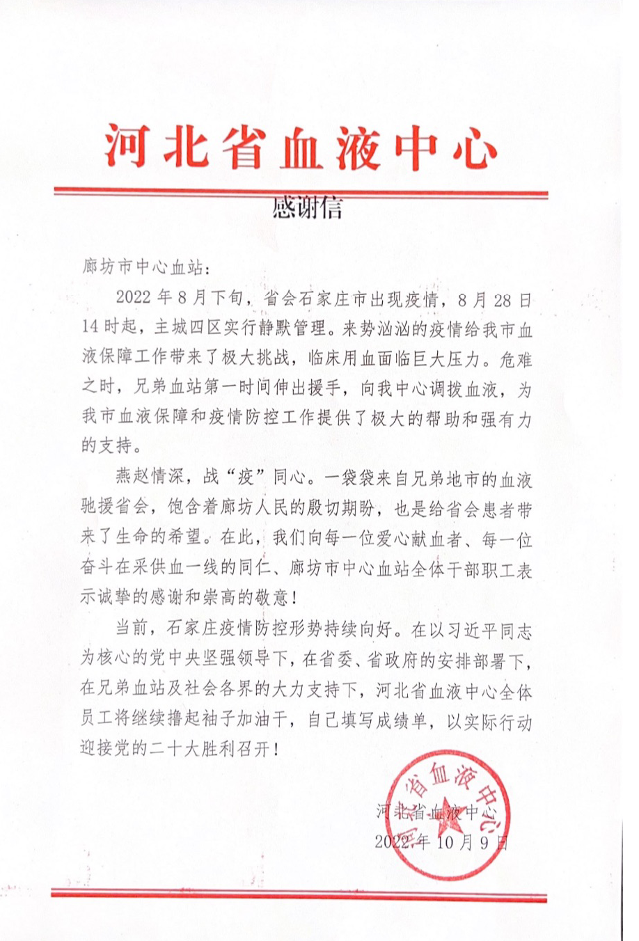 近日,廊坊市中心血站收到一封来自河北省血液中心的感谢信。信中写到,感谢廊坊市中心血站,感谢廊坊人民的热血传递!燕赵情深,战“疫”同心。一袋袋来自兄弟地市的血液驰援省会,饱含着廊坊人民的殷切期盼,也给省会患者带来了生命的希望。