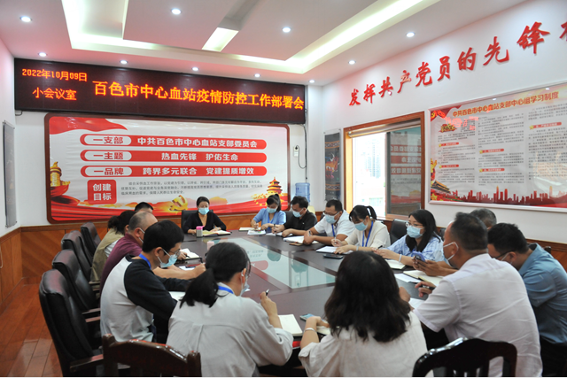 10月9日下午,百色市中心血站召开疫情防控工作布置会。会议结合目前我市近期疫情总体情况,针对全市采供血工作要点,对进一步做好有关工作进行部署。会议由血站党支部书记、站长梁朦尹主持,血站领导班子和各科室负责人参加。