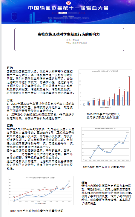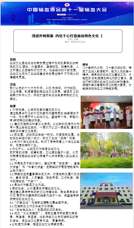 近年来,市中心血站坚持以献血者、用血者为中心,以质量安全为核心,构建“互联网+无偿献血”服务体系。提升“三大能力”即采供血保障能力、实验室检测能力和科研与技术服务能力。在输血大会征稿期间积极参与前期投稿工作,组织相关科室人员认真撰写高质量的学术论文10余篇。最终,经过协会专家组评审,外采科李洪媛《高校宣传活动对学生献血行为的影响力》,宣传科冯莉《浅谈外树形象内化于心打造血站特色文化》、成分科刘岩《血站成分制备过程中血液报废原因分析及预防方法分析》、输血服务科刘丽丽、赵素琴《免疫性血小板输注无效患者配型输注疗效分析》和《抗-HI和抗-EC抗体致抗体筛查阳性一例》等5篇论文入选大会并将于《中国输血杂志》全文发表,另5篇论文入选大会现场摘要发表及壁报展示。