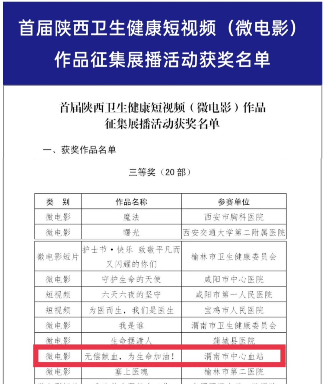 10月14日,由陕西省卫生健康委主办、陕西省医师协会健康传播工作委员会承办的“喜迎二十大、医心跟党走、奋进新征程”首届陕西卫生健康短视频(微电影)作品征集展播活动评选结果揭晓,渭南市中心血站选送的微电影《无偿献血,为生命加油!》荣获三等奖。