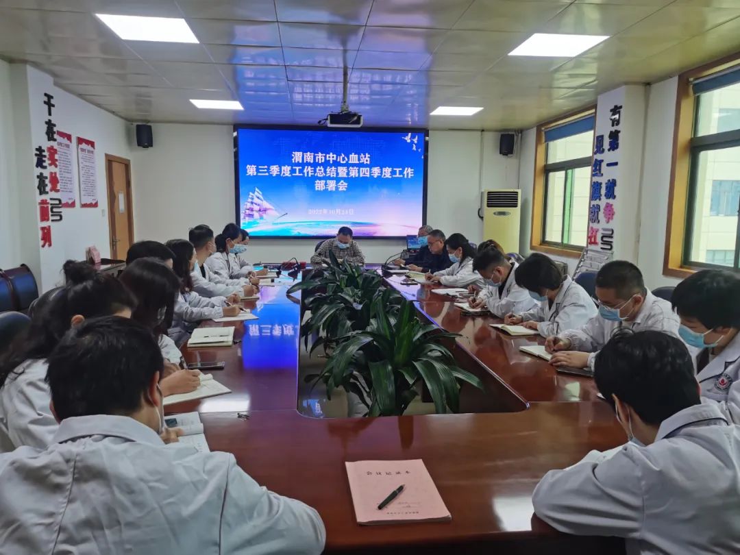 会议要求,在接下来的两个月时间里,我们要继续发扬优良作风,向年初既定的各项目标不断奋进。第四季度将重点做好以下工作:一是学习二十大精神,把学习宣传贯彻党的二十大精神作为近期一段时间的重要政治任务,要原原本本学,结合实践学,通过多种形式做好学习宣传工作。二是做好采供血各项业务工作,切实满足渭南人民群众的用血需求,迎接省市年度例行督查。三是举办科学合理用血培训会,配合市卫健委进行临床用血督导检查,持续开展成分输血专题讲座。四是对照创建服务型血站要求,加强干部职工的教育和培训工作,内强素质,外树形象。五是归口管理,专人跟进,确保我市无偿献血先进城市奖创建成功。六是持续推动安全生产专项整治三年行动巩固提高,立足全面总结专项整治三年行动以来各项任务的完成情况、主要指标的完成情况,分析存在问题并提出解决措施,同时扎实做好安全生产三年行动评估准备工作。七是以“对标荣誉找差距 凝心聚力促提升”“采供血工作高质量发展百日行动”工作任务为指导,激发干部职工干事热情,积极探索创新,提高业务技能,改进工作作风。八是持之以恒做好文明创建工作,创建国家级文明单位要确保每年得分105分以上。九是持续推进“渭南市万人流动血库”志愿服务项目,加大团体献血力度,不断提升公共突发事件的血液供给能力。