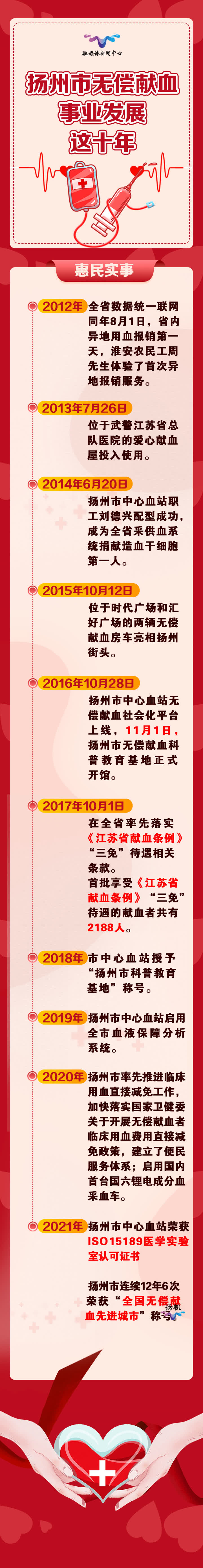 点滴爱心,汇成大海;无偿献血,无上光荣。展望未来,扬州将继续深入拓展献血服务的网格化建设,每年将新建1—2个献血服务网点来满足无偿献血的实际需要,全力保障临床用血需求,让扬州这座生机勃勃的全国文明城市更温暖、更和谐、更友爱。