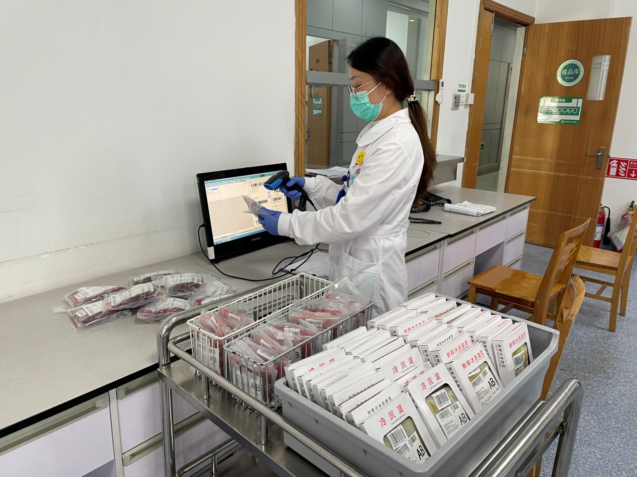 10月25日清晨5时20分,盐城市中心血站血库电话铃声骤响:“市一院一名产妇产后大出血,正在抢救,情况十分危急,急需大量AB型血液救治……”电话就是命令,时间就是生命。血库值班护士宋玲玲放下电话后,立即根据医院需求,悬浮少白细胞红细胞25U、新鲜血浆2325毫升、冷沉淀凝血因子24U、辐照单采血小板4U,准确无误的完成了血液发放工作。血液经过再次核对装箱后交给血液运输人员,一路疾驰,及时将承载着爱心和责任的救命血液送到医院。