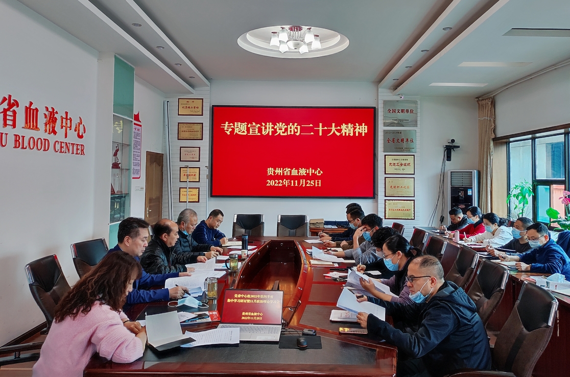 11月25日,省血液中心组织召开学习贯彻党的二十大精神专题宣讲会,中心党委书记朱思刚主持会议并宣讲党的二十大精神,中心领导班子成员出席会议。