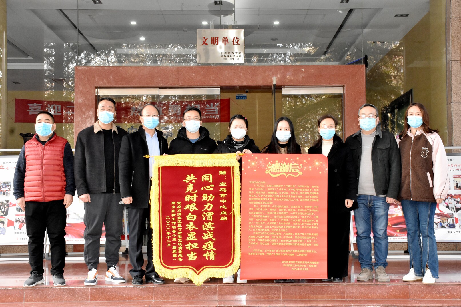 本轮核酸采样中,居民区入户采集占据较大比例,为此,血站5名工作人员明确分工,逐楼层逐户上门采集,按要求做到应采尽采,不漏一人。日复一日,连续作战,汗水浸湿了衣襟,口罩勒红了脸庞,但是没有一个人喊苦叫累,大家在默默坚守中践行着医者的责任和使命。渭滨区疫情指挥部给血站采样队赠送了锦旗和感谢信,其中锦旗上书写的“同心助力渭滨战疫情,共克时艰白衣显担当”是对5名采样人员近期工作的最高肯定和褒奖。
