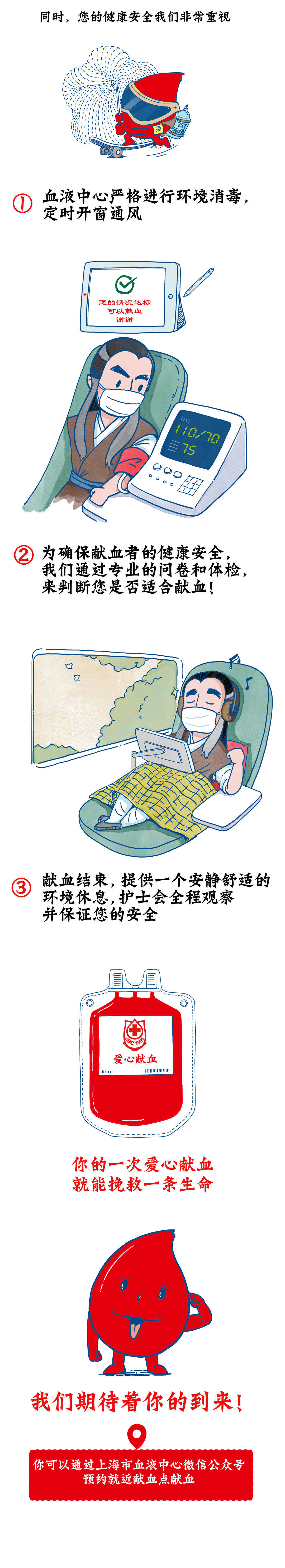 答: 献血是安全的。上海市血液中心严格落实《医务人员手卫生规范》 等感染控制措施的要求。工作人员严格做好工作场所环境消毒 ,定时开窗通风,做好个人防护、手卫生、和医疗废物管理等感染预防与控制工作。努力保障每一位献血者的安全。同时,市民们也可以通过上海市血液中心微信公众号选择就近献血点预约献血。