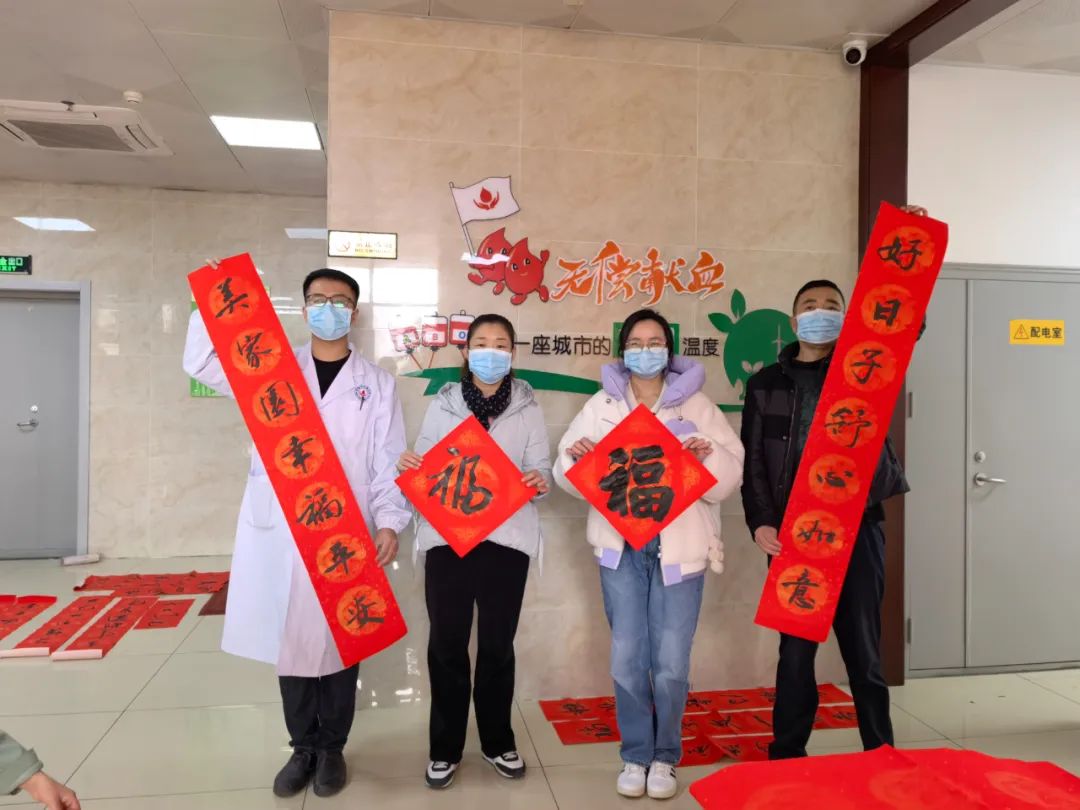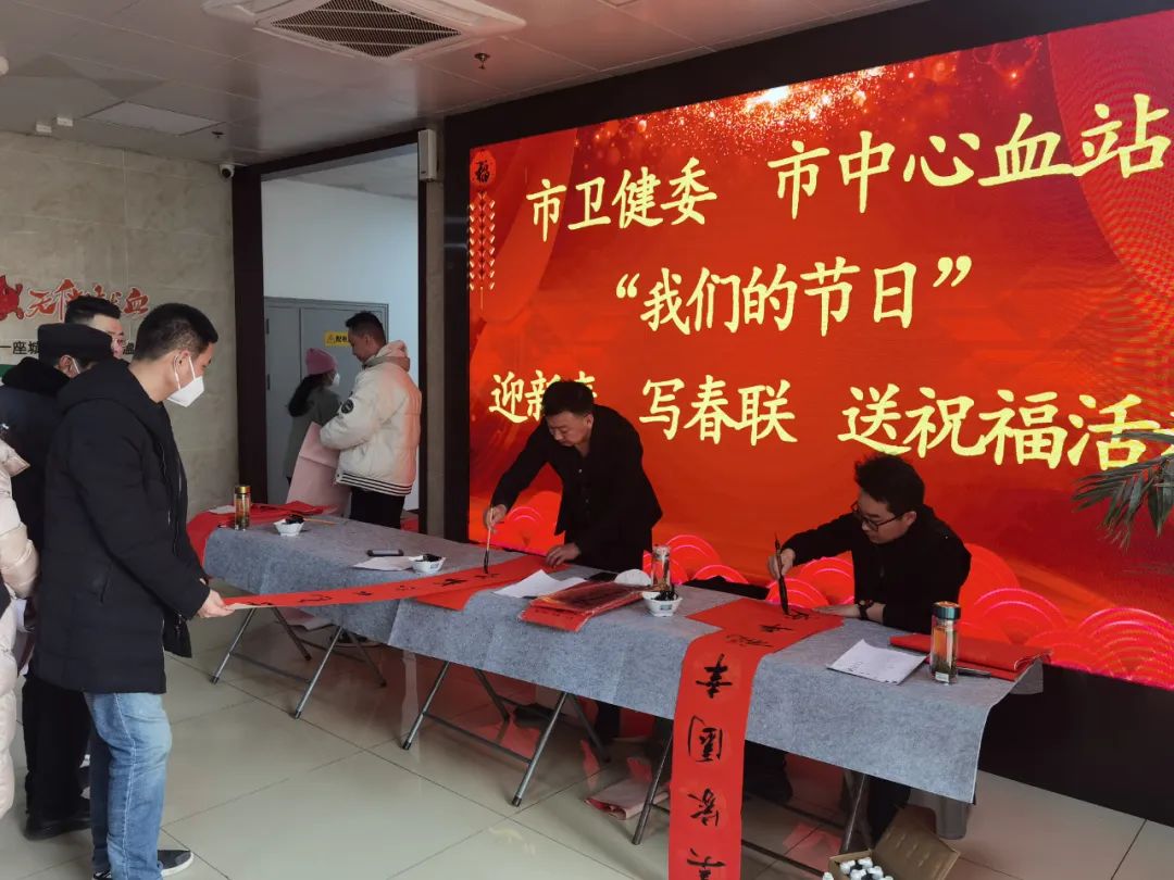 无联不成春,有联春更浓。在兔年春节来临之际,为营造喜庆热烈、文明祥和的节日氛围,1月17日上午,市卫健委联合市中心血站开展了“我们的节日·写春联”活动,活动邀请了渭南高新区书法家协会副主席兼秘书长董辈、副秘书长贠高宏、书法家任志登、王近亲临血站,为在岗职工及离退休职工献上珍贵的墨宝、送上新春的祝福。
