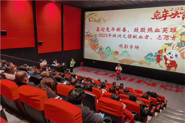 喜迎兔年新春,致敬热血英雄。1月27、28日,株洲市红十字无偿献血志愿者服务大队联合株洲苏宁影城、株洲神农大剧院开展“喜迎兔年新春,致敬热血英雄——株洲市无偿献血者、志愿者观影”活动,百余位献血者、志愿者代表们齐聚一堂、欢乐观影,共同庆祝兔年新春。