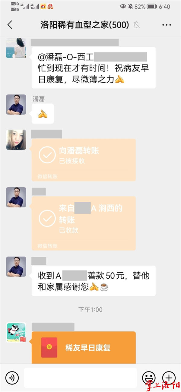 早日康复!”“一点心意请接收!”2月2日,“洛阳稀有血型之家”微信群内被红包和转账信息刷屏,群管理员潘磊看到众多志愿者纷纷鼓励、伸出援手,不禁感动落泪。他将援助信息一一登记并逐一向援助者致谢。