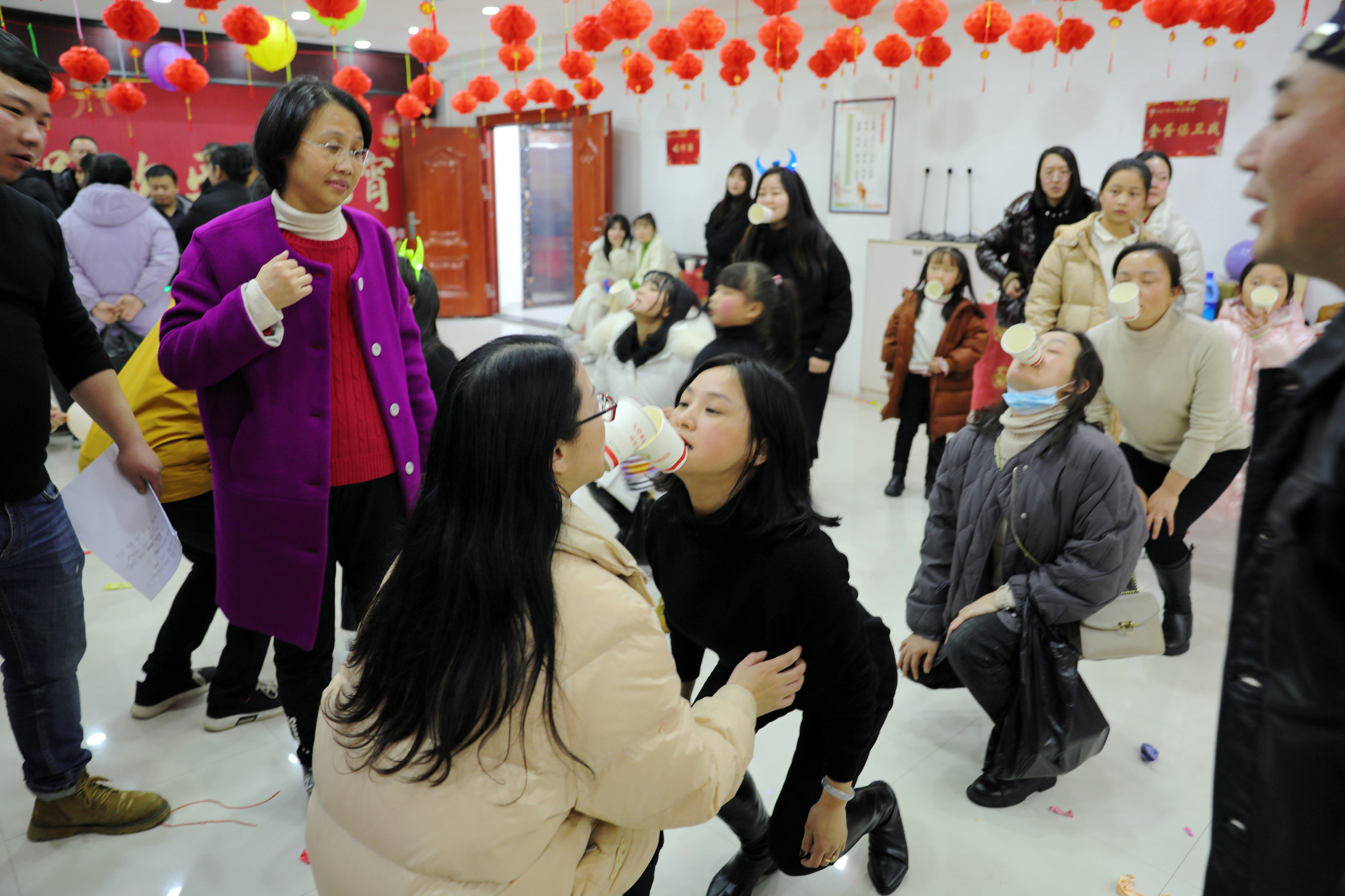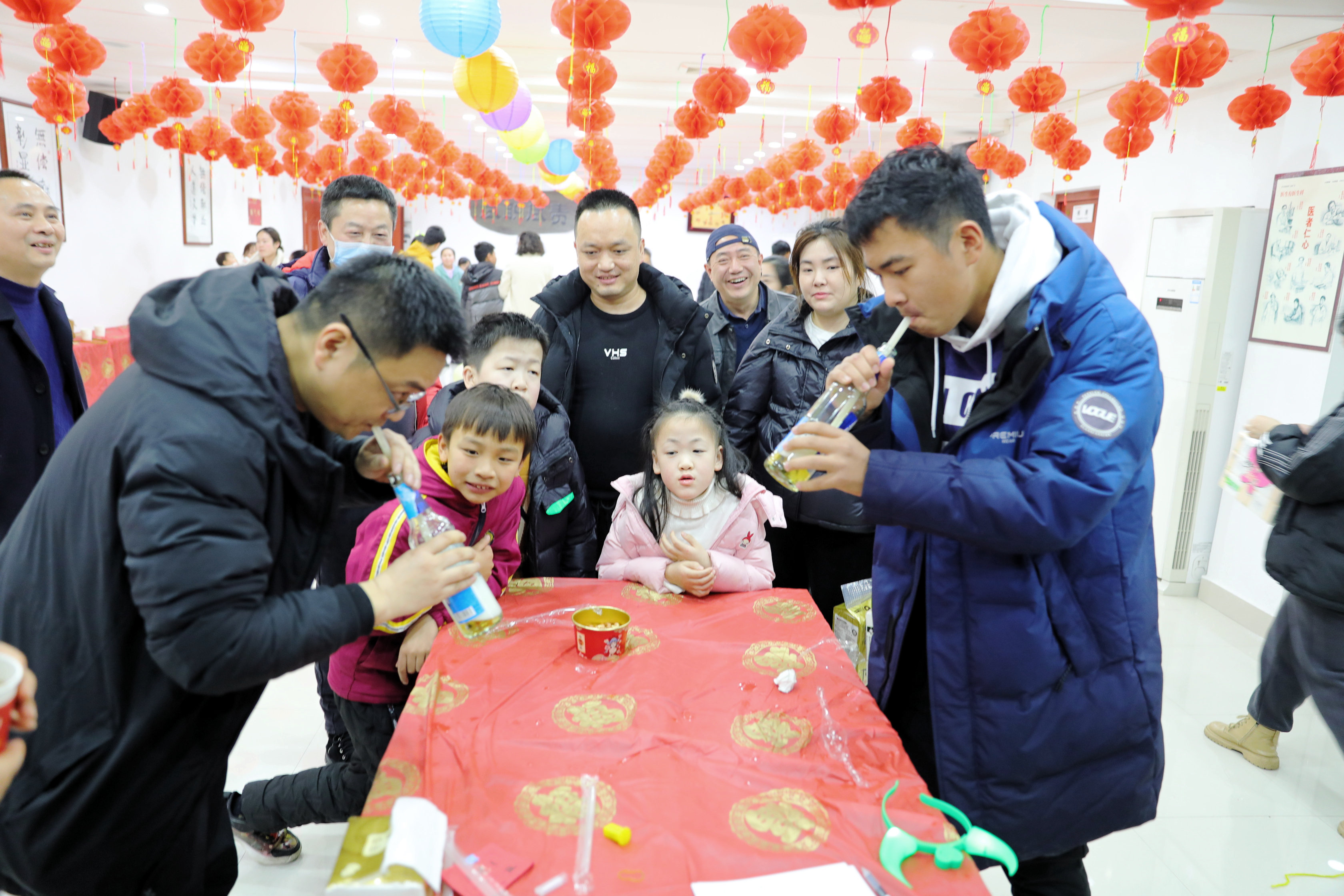 猜灯谜、金蛋保卫战、踩气球、投壶、吸啤酒、套圈等有奖小游戏五花八门,精彩纷呈。活动现场还准备了美味的汤圆、饺子、水果、零食、饮品。