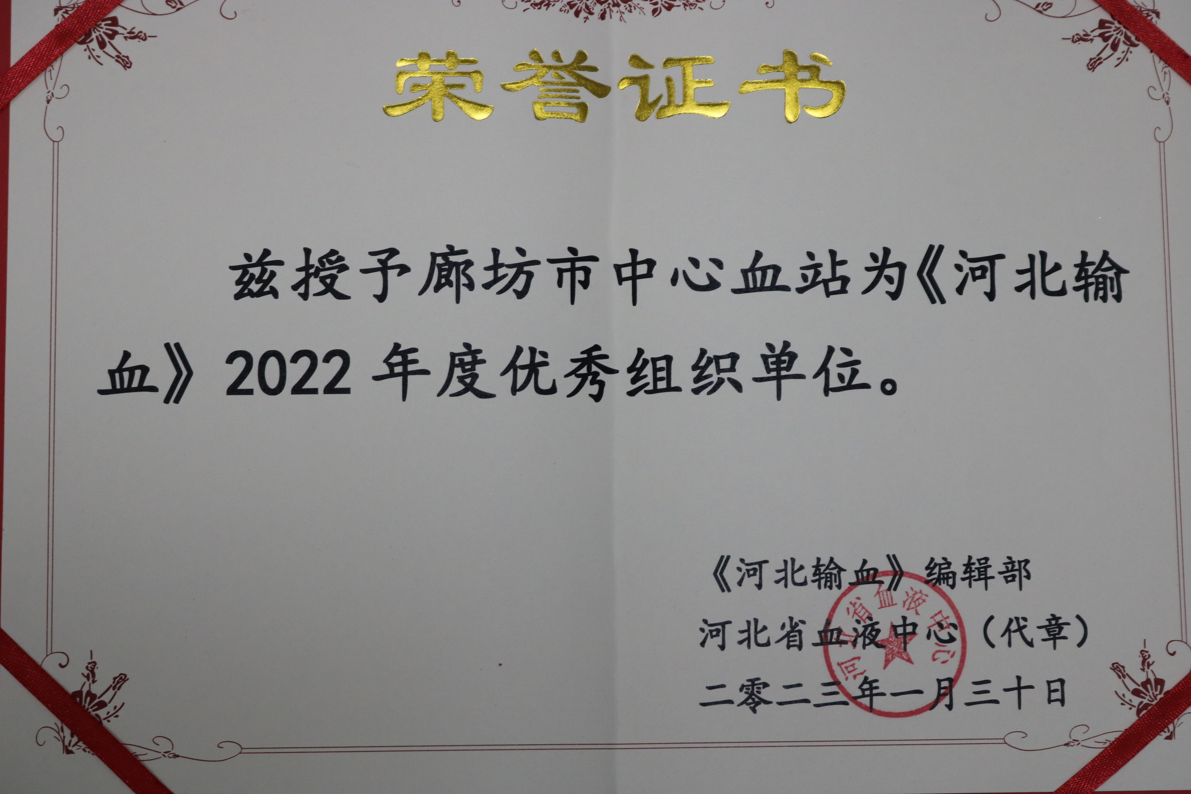 廊坊市中心血站 连续四年荣获《河北输血》优秀组织单位荣誉称号