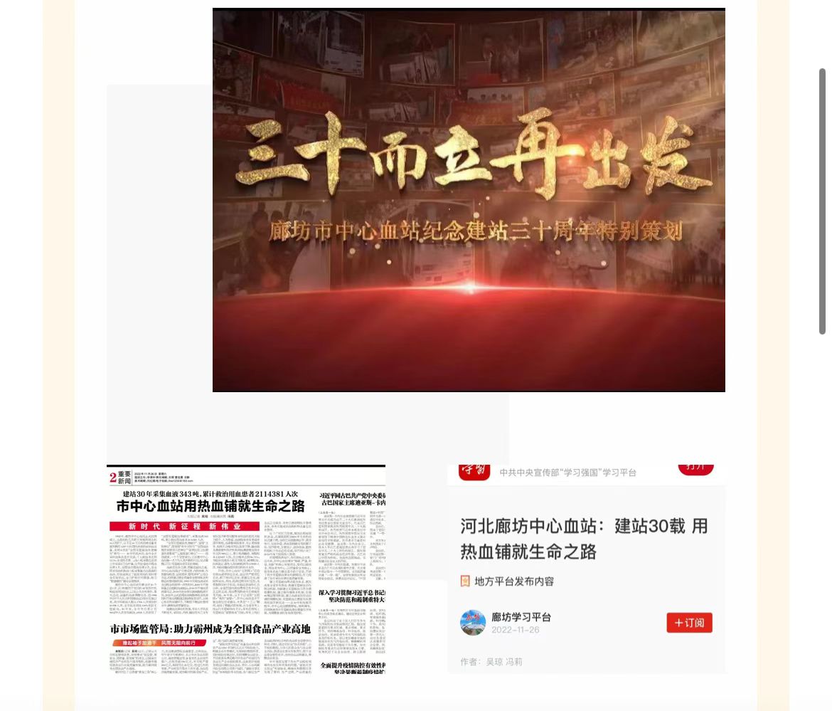 专题推文《建站三十载 用热血铺就生命之路》、《廊坊市中心血站30年采血343吨,救治用血患者211万人次》在学习强国廊坊频道、河北共产党网、《河北输血》杂志、廊坊日报、廊坊都市报刊载。