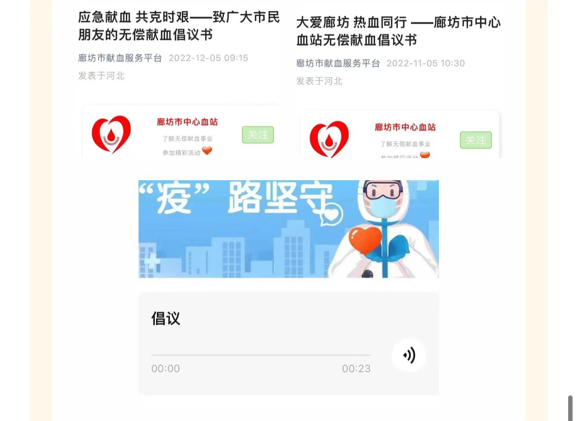 2022年,血站信息报送377篇,献血服务平台关注58088人、较去年增长22%,微信平台点击量13.8万余次,网易廊坊献血服务专题网页发布信息142条;精心策划推出原创科普栏目“廊坊献血街访”6期,观看人数达到9000余人。