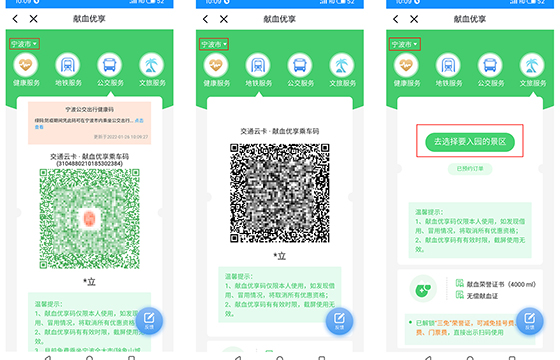 为提升献血者荣誉感、获得感和满意度,近年来宁波市优化了无偿献血者关爱措施,将现有献血“三免政策”的关爱措施进行智能化改造,实现了全省《献血者荣誉证》获得者可以通过扫“献血优享”码享受免费乘坐公交地铁服务和浏览公园旅游风景区,实现无偿献血荣誉证获得者在全市所有非营利性医疗机构就诊挂号时智能减免门诊诊查费。