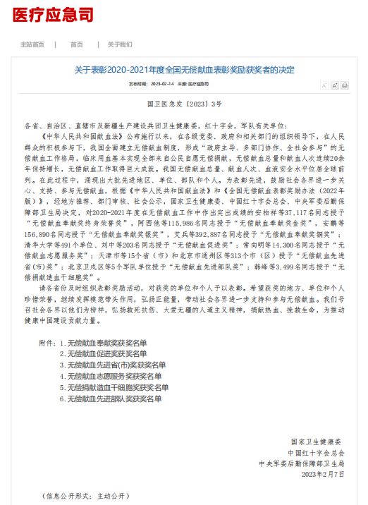 血液是生命之源,无偿献血是赠予无数病患最温暖的生命礼物。为感谢这些无偿献血爱心人士的无私奉献,营造温馨和谐的无偿献血氛围,近日,国家卫生健康委、中国红十字会总会、中央军委后勤保障部卫生局联合下发《关于表彰2020-2021年度全国无偿献血表彰奖励获得者的决定》。本次表彰中,我市共有1094位无偿献血者荣获“全国无偿献血奉献奖”(其中“全国无偿献血奉献奖金奖”172人;“全国无偿献血奉献奖银奖207人;"全国无偿献血奉献奖铜奖”715人。)肖小龙、罗杰等69人荣获“全国无偿献血奉献奖”终身荣誉奖;罗淑凤、陈泽睿等52人荣获“全国无偿献血志愿服务奖”。