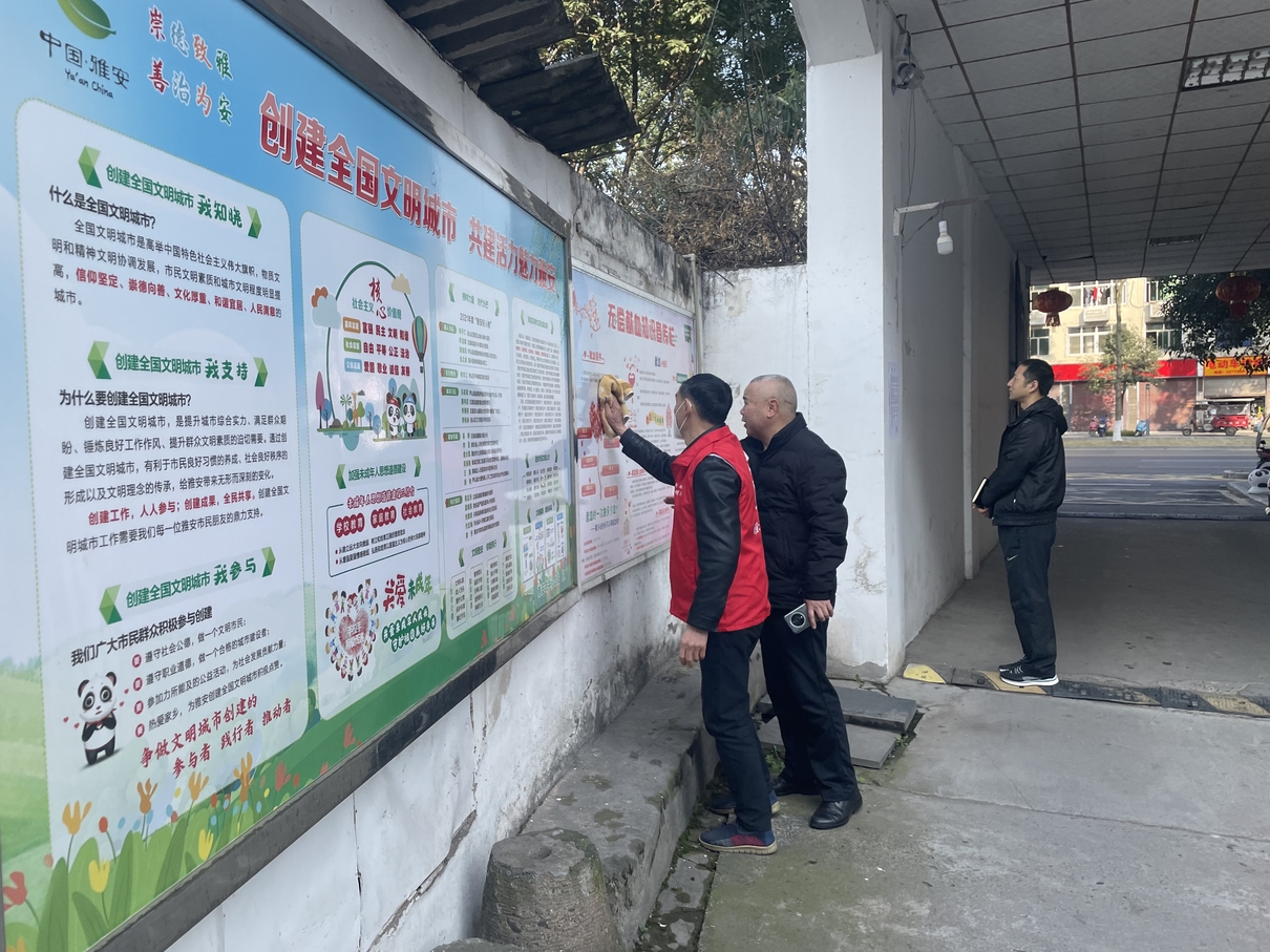 在检查工作中,强调要做好消防、安全、卫生等自查自纠工作,查遗补漏;志愿者和工作人员要做好环境卫生工作,维护良好公共秩序,发现不文明现象立即制止,为创建工作做好充分准备;向商户宣传无偿献血知识,深入讲解了创建全国文明城市的意义,呼吁大家争当文明市民,从我做起,从小事做起,齐心协力为创建全国文明城市做出贡献,把雅安建设的更加美丽。此次检查更换老旧宣传栏6个,新增3个。