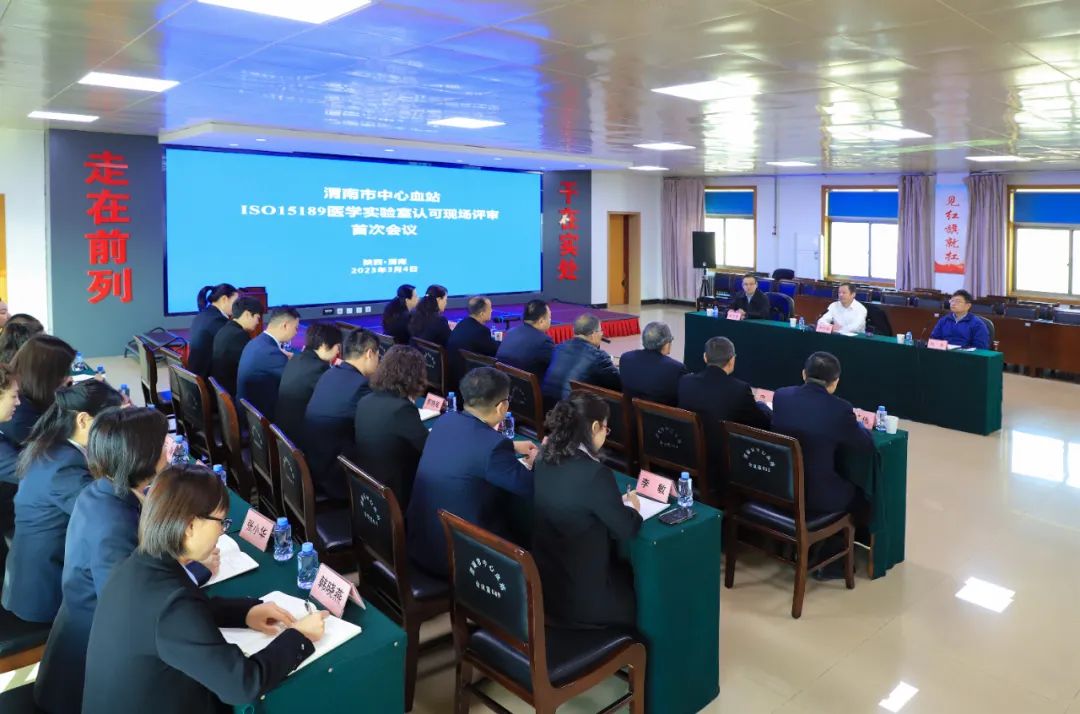 在评审组的首次会议上,卢行安组长介绍评审流程,市卫健委三级调研员周增荣、渭南血站站长严胜利对评审组表示欢迎和感谢,副站长张麦利向评审组汇报了血站质量管理体系运行情况及认可准备工作。