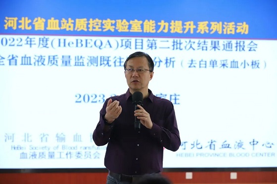 会议还回顾了自2021年河北省血液中心、河北省输血协会联合开展的全省血站质控实验室能力建设系列提升工程实施以来的工作,全省血站质控管理部门围绕深度协同建设目标,陆续完成了《冬奥会血液成分质量测评项目》《河北省采供血机构质控实验室全血及成分血质量监测可比性平台框架搭建及试行方案》《全血及成分血质量监测方法河北省采供血机构质控实验室共识(试行)》,并继浙江省之后,在国内第二家实施了《全省血站质控实验室室间质评(HeBEQA)项目》。在全省血站质控实验室支持下,汇总整理了2015—2021年血液抽检历史数据,总计近19.8万条,陆续分析整理了新鲜冰冻血浆、冷沉淀凝血因子、去白血小板、去白悬浮红细胞等质量指标的省域参考值区间,初步搭建了具有可比口径的血液成分指标可视化数值框架,为12家血站提供了自身指标全省站位图,使血站首次知晓了所采集、制备血液的具体组分、剂量,此两项工作走在了国内血站前沿。