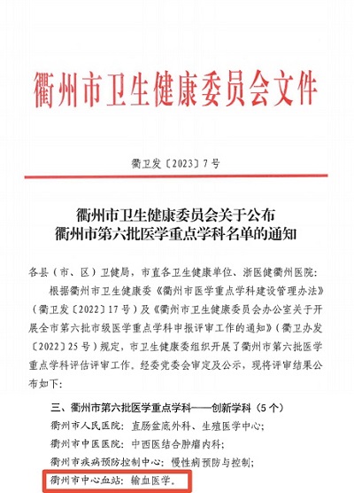 喜讯!衢州市中心血站输血医学学科获批衢州市第六批医学重点学科