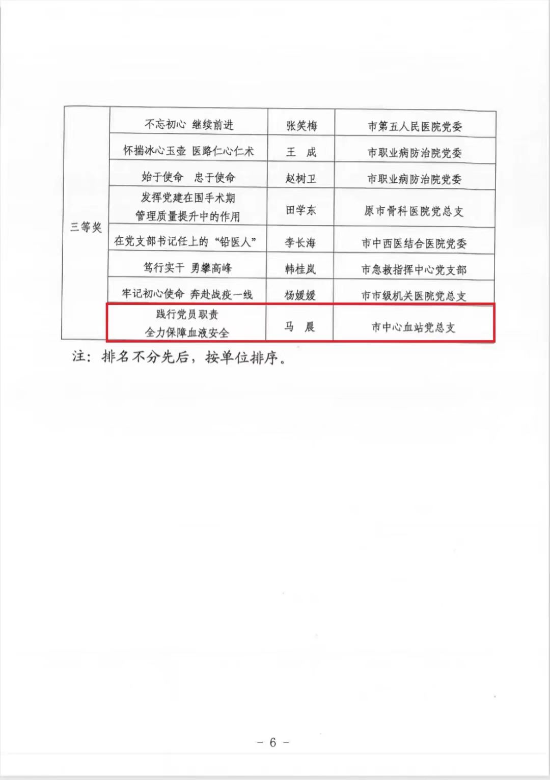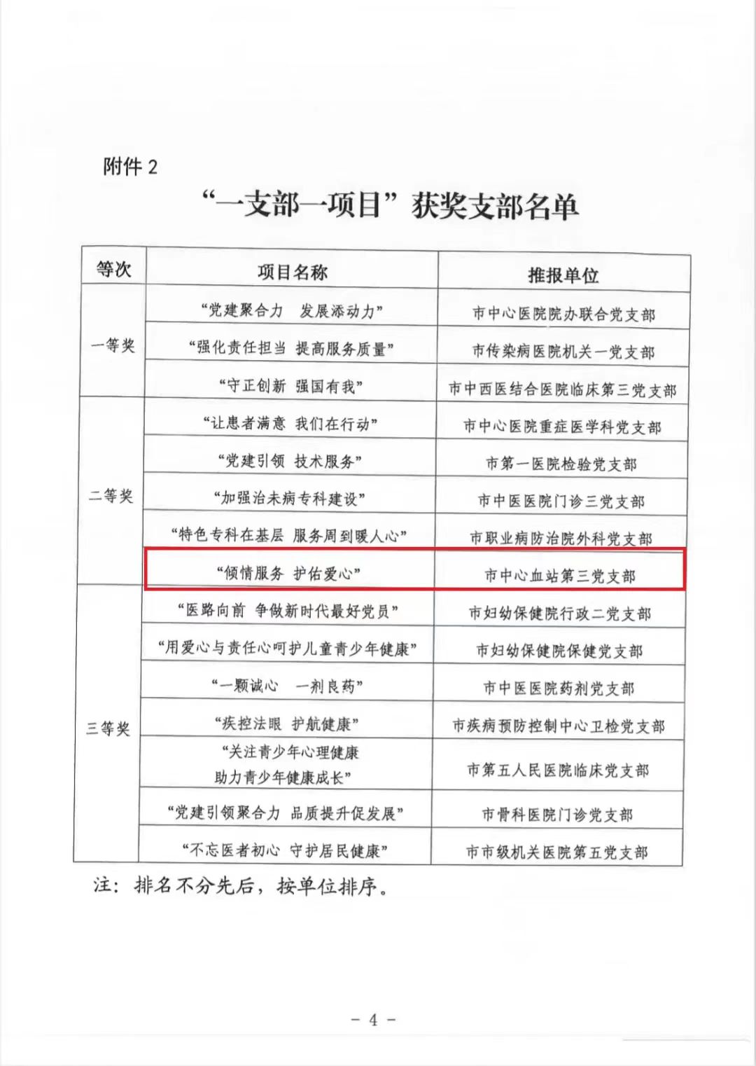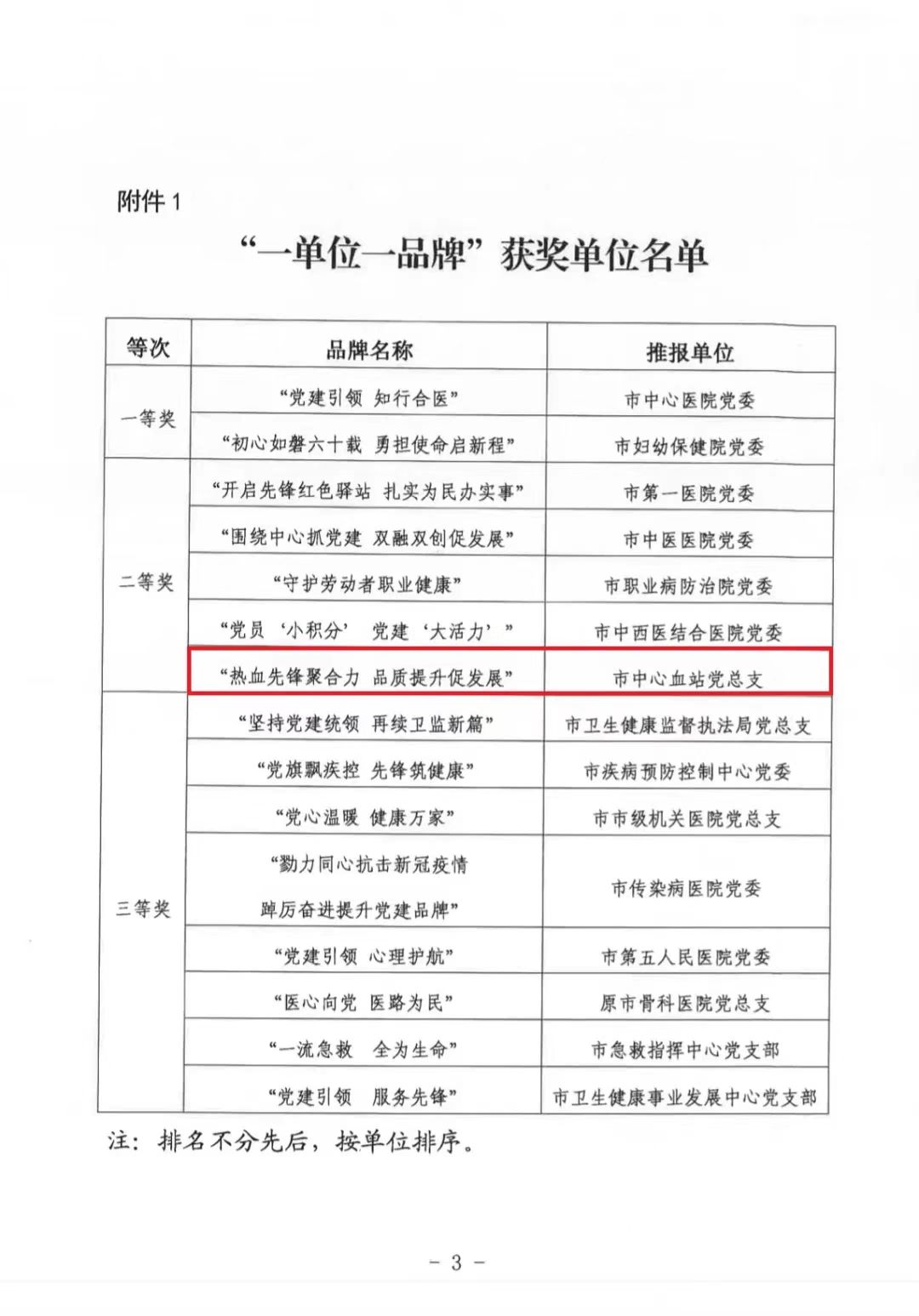 近日,中共淄博市卫生健康委直属机关委员会下发《关于表扬2022年度市直卫生健康系统“一单位一品牌、一支部一项目、一党员一任务”获奖情况的通报》(淄卫直党发(2023)1号),淄博市中心血站党总支获“一单位一品牌”二等奖,第三党支部获“一支部一项目”二等奖,1名党员获“一党员一任务”三等奖。
