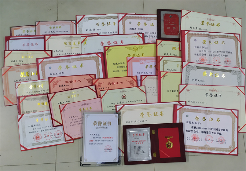 关于无偿献血,刘筱杰荣获了许许多多的奖项,曾7次荣获全国无偿献血奉献奖金奖、1次荣获全国无偿献血奉献奖终身荣誉奖,但最令他影响深刻的是2001-2003年度无偿献血促进奖。他说:“那是海南的第一座奖杯,当时站在人民大会堂接受国家领导们的颁奖,既感谢又感恩,如果不是无偿献血,我都没有机会去北京呢。”