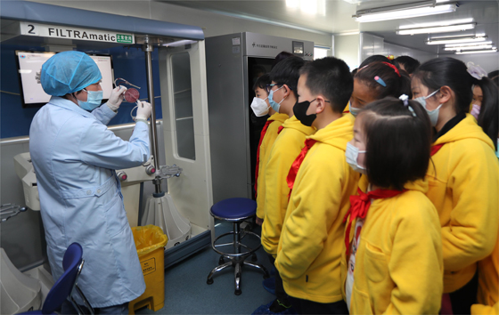 随后,大家依次参观了人道主义传播及教育基地和成分科、检验科、机采科、血液管理科等主要业务科室,现场了解血液从采集到检验、分离制备、贮存、供应的全过程,见证了一袋血的爱心之旅。参观过程中,小记者不时地提出问题:什么是血液?什么是血型?无偿献血的基本条件等,工作人员一一耐心解答。在机采科,正在捐献血小板的无偿献血者向同学们分享自己的献血经历和心得体会,鼓励小记者们长大后能够积极地参加无偿献血。