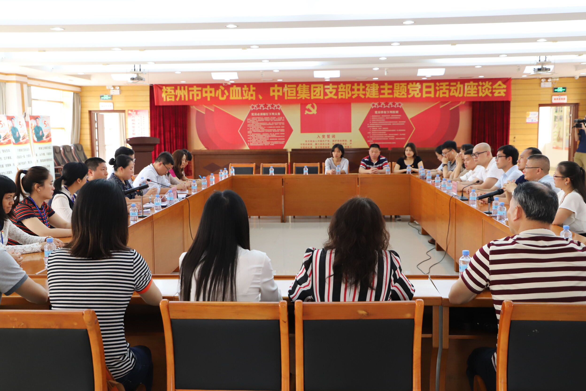 4月22日,中恒集团陈海波党委副书记率总部行政党支部党员代表一行到梧州血站相互交流党建工作。