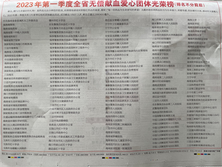 海南省血液中心在《海南日报》刊登了