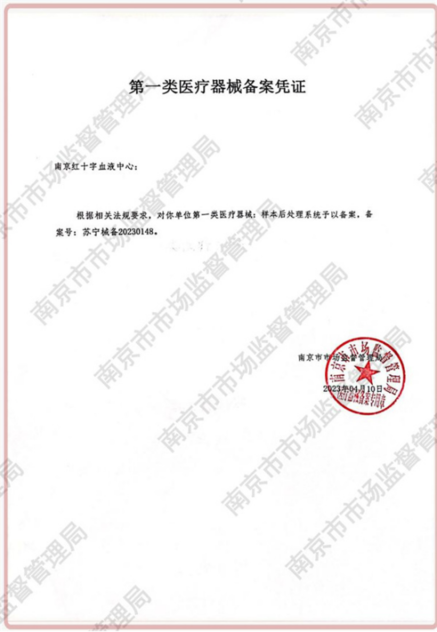随着新版《医疗器械监督管理条例》(以下简称《条例》)的颁布,新《条例》全面实施医疗器械注册人制度,为医疗器械产业发展带来了新机遇,科研机构可以成为医疗器械的注册人。为此南京红十字血液中心自主研发的“样本后处理系统”经过为期二年的设计、选型、设备检测等工作,于2023年4月10日取得了由南京市市场监督管理局颁发的《第一类医疗器械备案凭证》(苏械备20230148 )。该备案证是江苏首张非企业性质,属于事业单位权属的医疗器械备案证书,也是南京红十字血液中心取得的首张第一类医疗器械备案证书。同时该项目也受到了南京市科技发展十三五重大项目及重点项目基金支持。