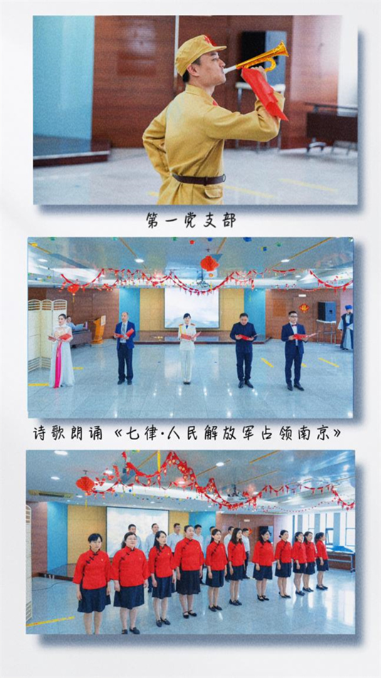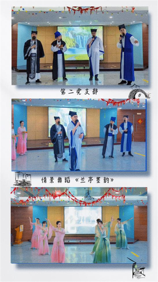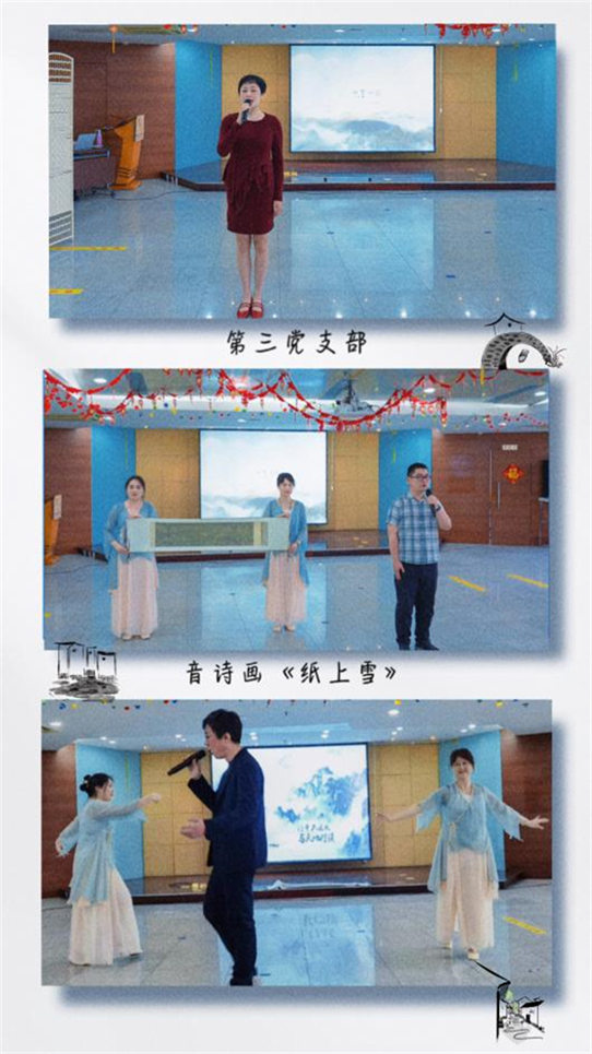 4月23日,是第28个“世界读书日”,也是南京解放纪念日,第一党支部所属科室全体党员、民主党派和团员青年代表带来了诗歌朗诵《七律•人民解放军占领南京》,铿锵有力的朗诵带领我们一起穿梭回到那激情燃烧的岁月。第二党支部带来情景舞蹈《兰亭墨韵》,演员们身着精彩绝伦的汉服窈窕脉脉,在舞韵之间向我们展示了天下第一行书《兰亭序》的创作故事。而第三党支部的音诗画《纸上雪》则漫步于《江干雪霁图》的山河雪景中,低吟浅唱,传达出“对雪忆故人”的独特情怀。
