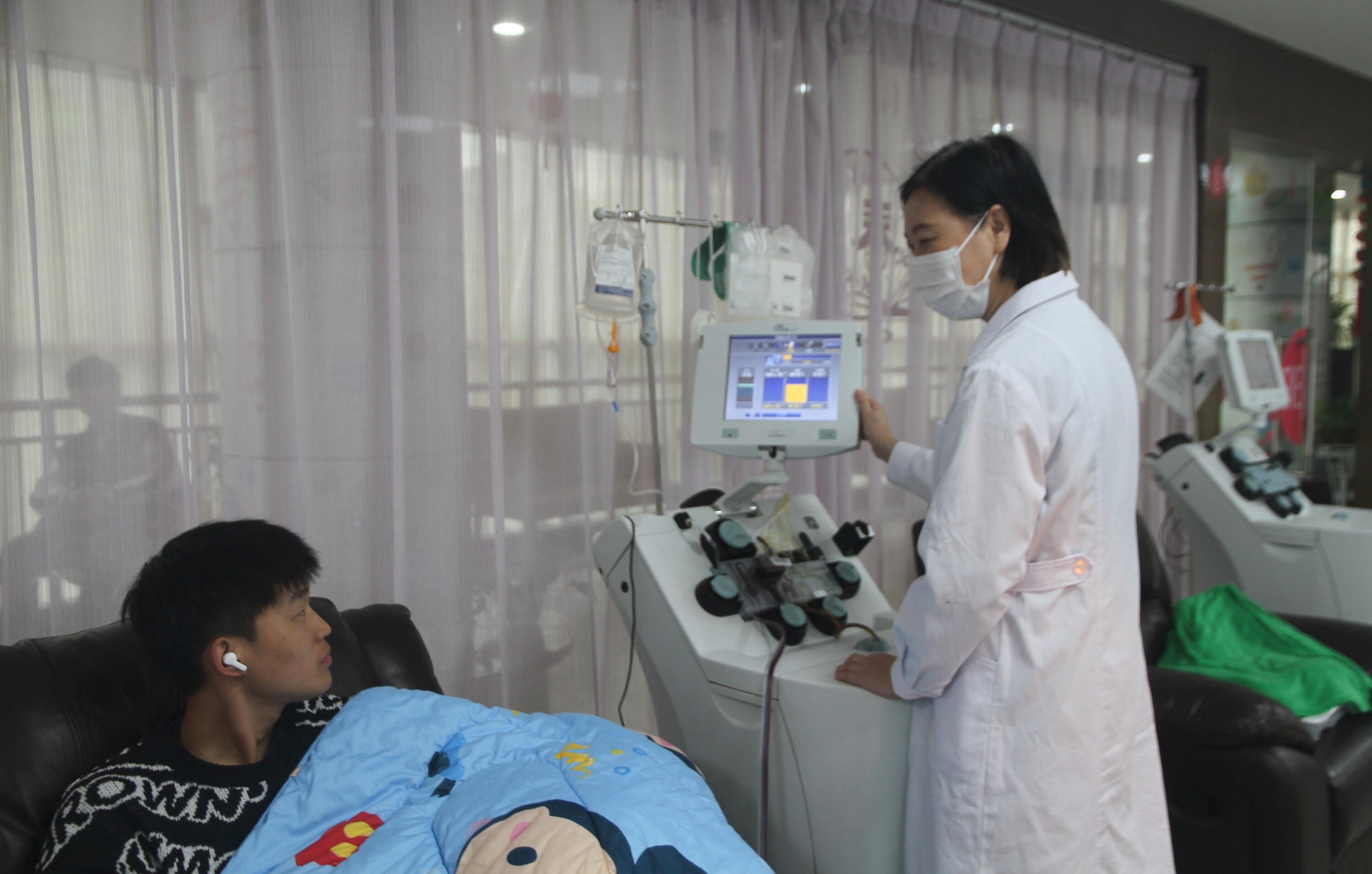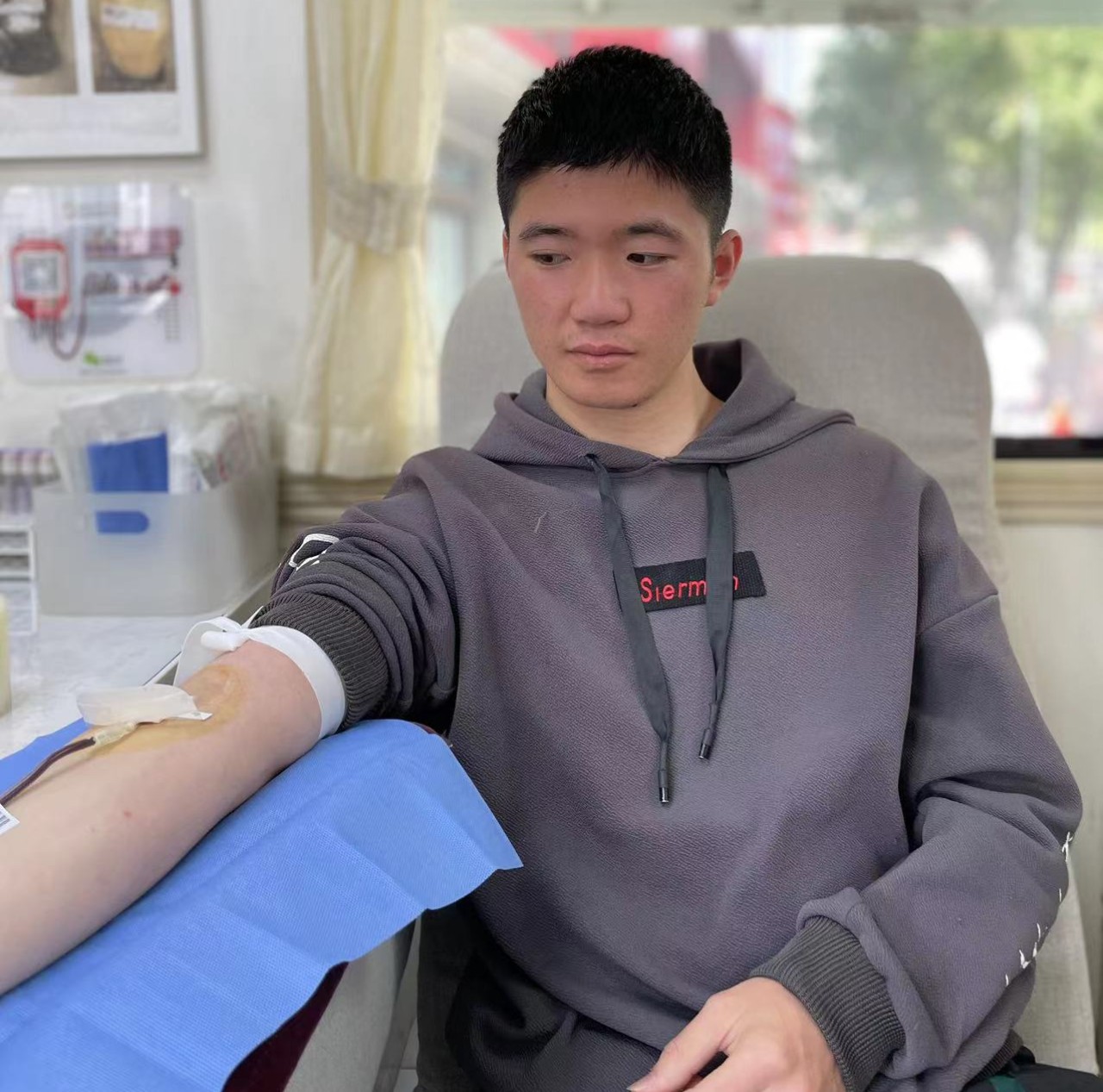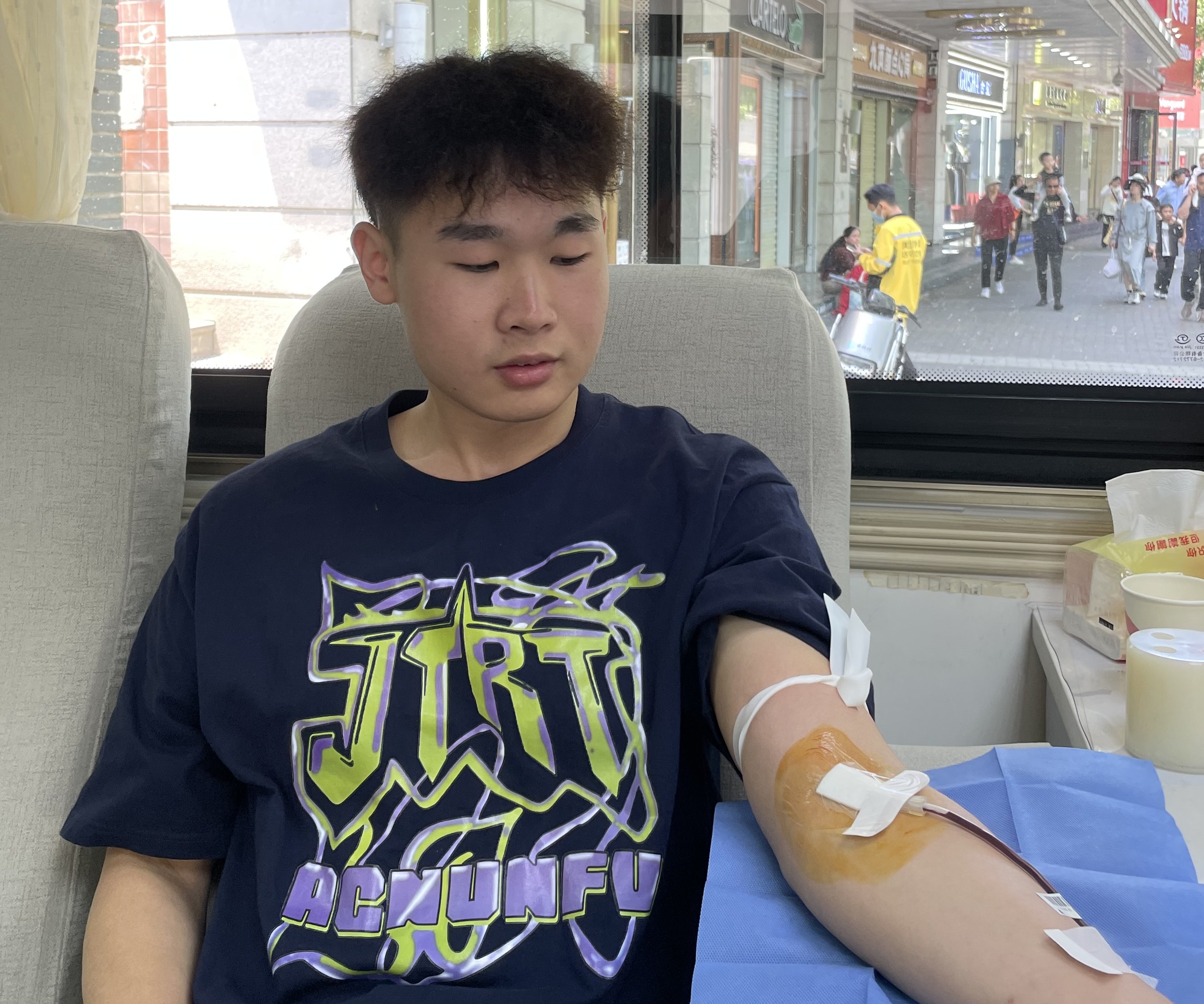 献血者徐家宝自身是学药学专业,现已投入医药工作。乘着五一假期来南昌游玩依然决定走上献血车。虽是第一次献血,心里小有紧张,但是在交谈中得知他在读书期间就有了解过献血,但是没有机会。今日走上街头看到献血车就毅然决然的走上来了,献完血晚上还要投入自己紧张的工作当中。