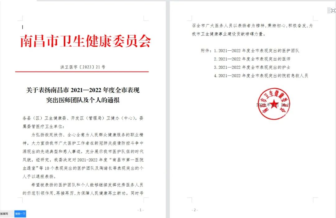 为弘扬救死扶伤、全心全意为人民群众健康服务的职业精神,大力宣扬我市广大医护工作者在新冠肺炎疫情防控斗争中涌现出的先进典型和感人事迹,充分展示我市医护队伍的时代风貌,南昌市卫健委决定对 2021-2022年度10个表现突出的医护团队及表现突出的个人给予通报表扬。我站献血服务部荣获“2021-2022年表现突出医护团队”殊荣。