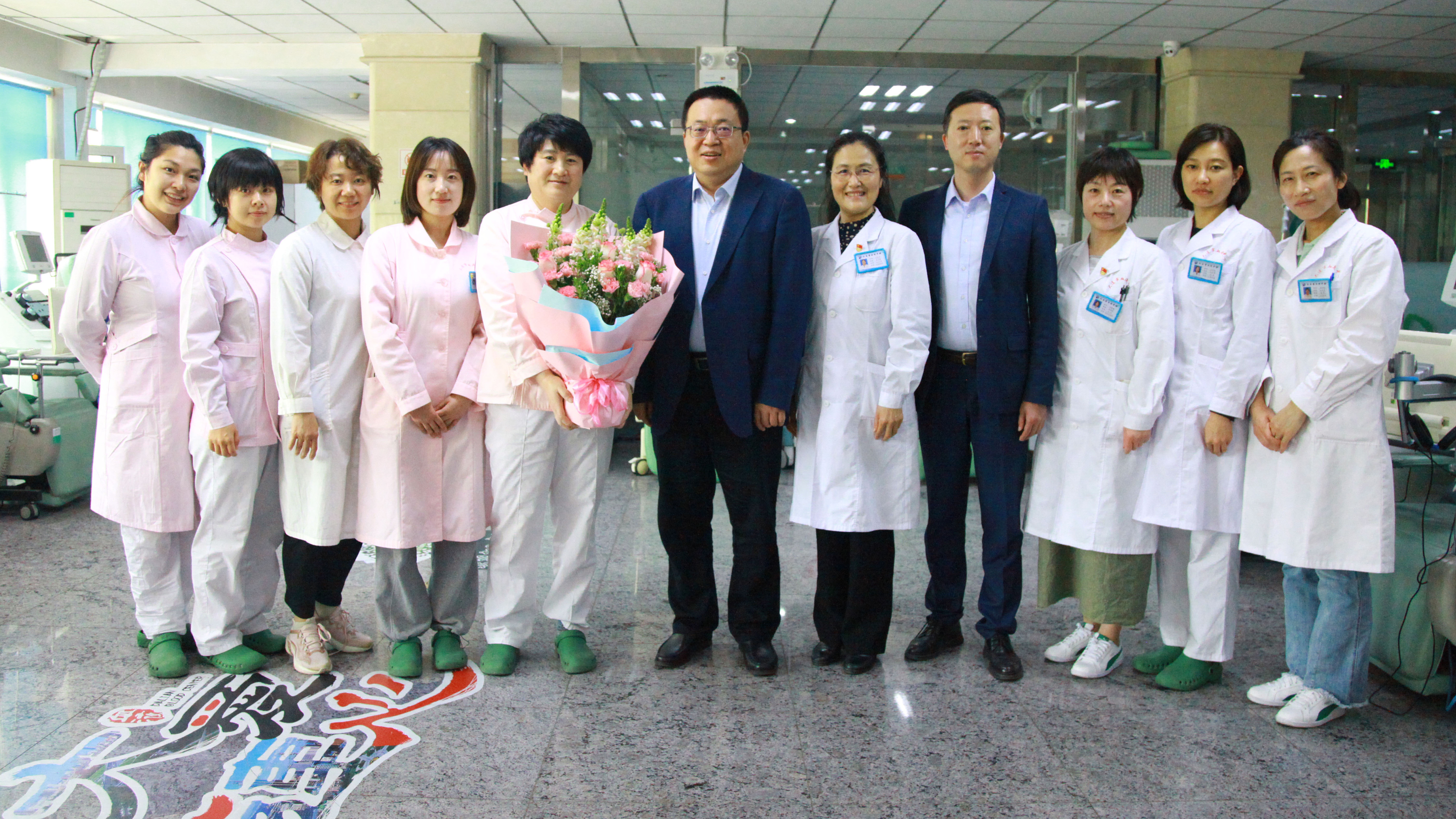 大连市血液中心主任梁晓华、业务科科长宫本兰等一行人先后来到输血科、机采科、沙河口区献血屋、西岗区献血屋,将代表满满心意的鲜花送到护士们手中,祝愿大家节日快乐!