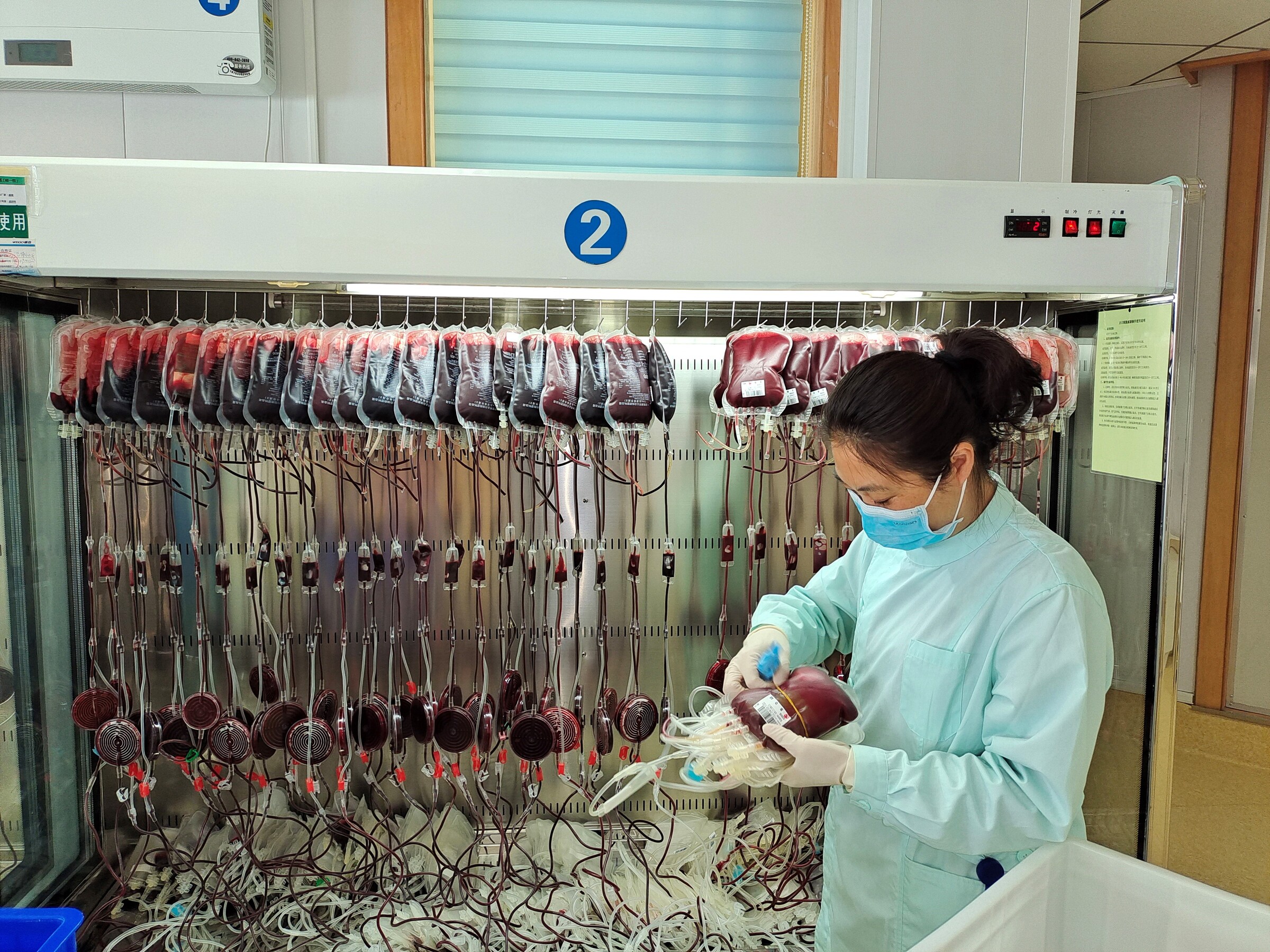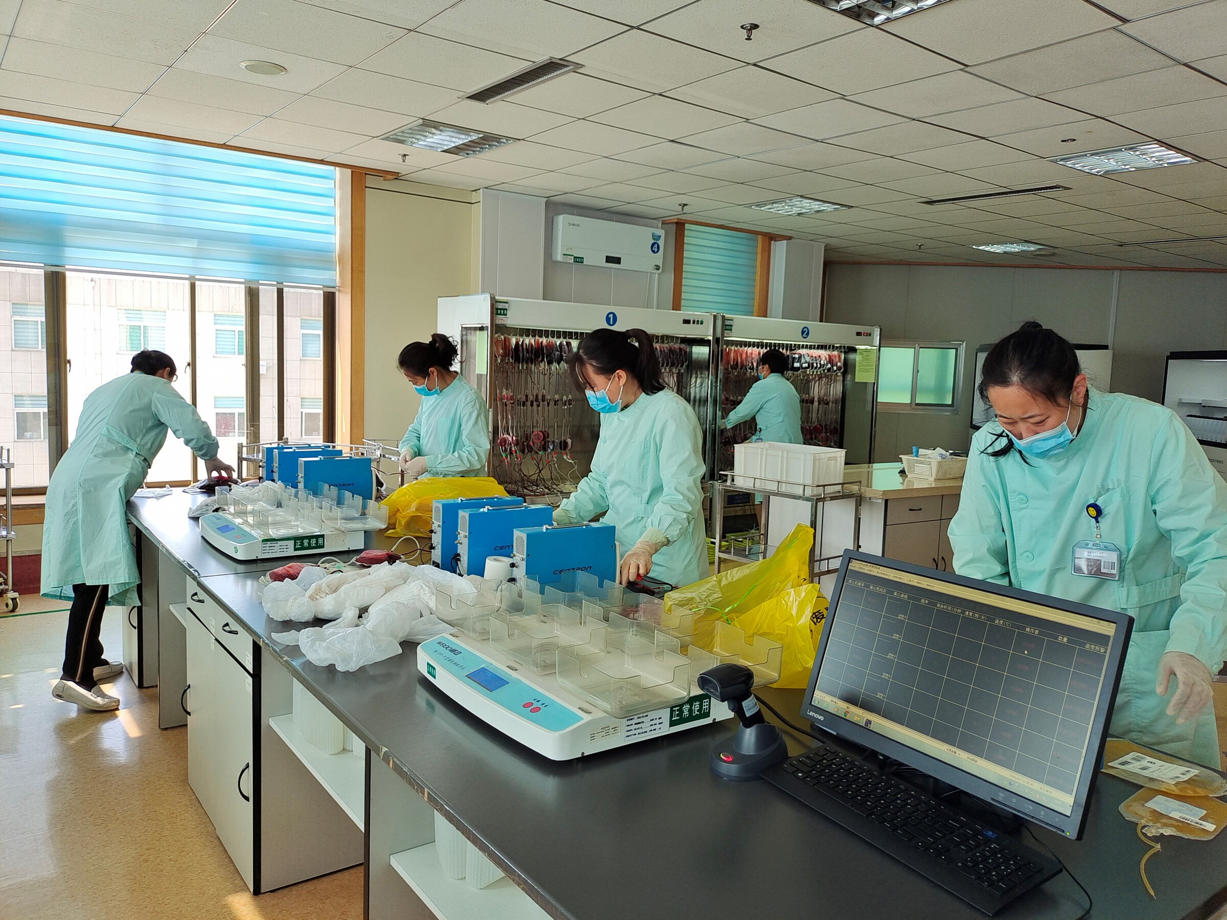 “今天一共182袋血,请核实并接收。”随着淄博市中心血站待检室的一个电话,成分制备科吹响了“五一”节工作的号角。首先要对所采集的全血滤除白细胞,摇匀、关卡、挂袋、掰塞每一步都缺一不可,稍有不慎就会影响滤白效果。配平是血液分离的重要环节,要确保每一组装袋全血重量近似才能进行离心。经过20分钟的离心,悬浮红细胞与血浆呈现分层,之后再通过分离机将悬浮红细胞与血浆完全分离。血液分装是是成分制备科每日主班担负的重要任务,“五一”节当天主班在完成血液接收、血液发出、血液转化、扫描打签的同时,共完成三次血液分装。