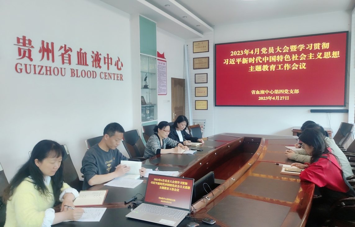 贵州省血液中心第四党支部学习贯彻习近平新时代中国特色社会主义思想主题教育自今年4月启动以来,在中心党委的正确领导下,在支部班子的引领带动下,全体支部党员共同参与,确保高标准起步、高效率开展,注重彰显自身特色,呈现出“谋划部署及时”“理论学习扎实”“推动工作落实”的良好局面,支部主题教育有力有序有效推进。