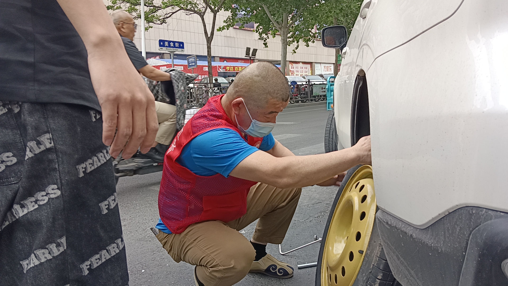 忽然,一辆河北的车停在了献血车旁边,车上下来一位小伙子,围着车左转右转,一副很着急的样子。赵队长看到这种情况立刻上前询问,得知小伙的车胎被扎了,他对这种情况没有什么经验也不知道怎么处理,正束手无策。赵队长一边安慰他不要着急,一边蹲下身子帮他修理车胎,边干边给小伙介绍处理类似情况的经验,经过半个多小时的拆卸和修理,终于把车轮胎安装完成。