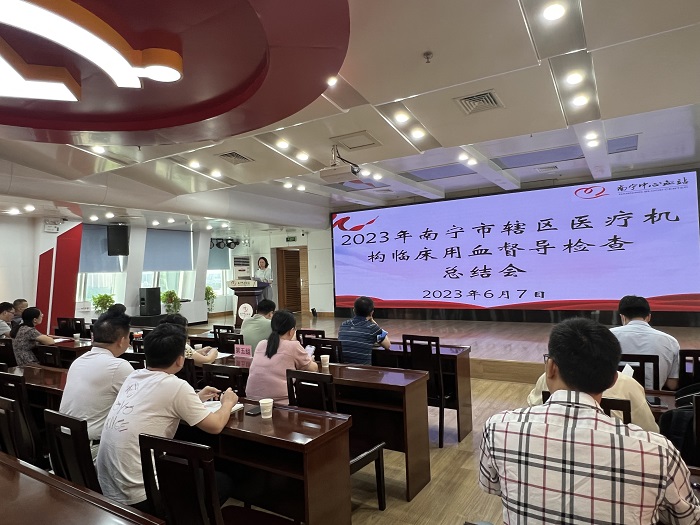 南宁临床输血质量控制中心于2023年5月8-12日对辖区内83家用血医疗机构进行临床输血质量监督检查,为总结经验,2023年6月7日下午,在南宁中心血站十六楼会议室召开2023年临床输血质量监督检查总结会,本次临床输血督导检查的八个小组专家及联络员参加会议,会议由南宁中心血站副站长莫秋红主持。