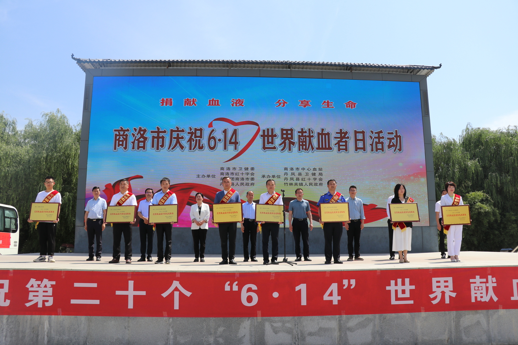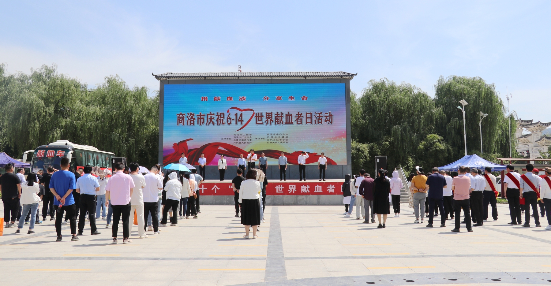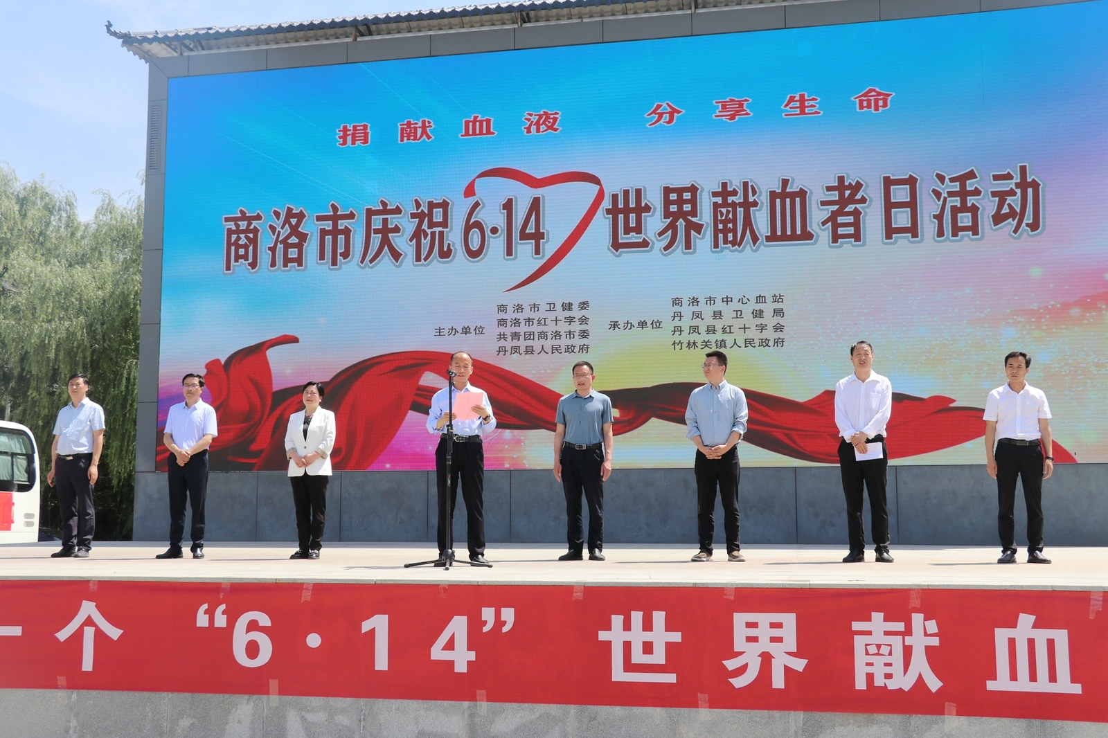 为表达对无偿献血者的崇高敬意,弘扬无私奉献的传统美德,6月8日上午,由市卫健委、市红十字会、共青团商洛市委、丹凤县人民政府主办,市中心血站、丹凤县卫健局、丹凤县红十字会、竹林关镇政府承办的第二十个“6.14”世界献血者日庆祝活动在丹凤县竹林关镇举行。市县镇相关领导、全市无偿献血先进集体和先进个人代表、无偿献血志愿者、竹林关镇政府干部职工、广大群众和新闻媒体记者共200余人参加活动。