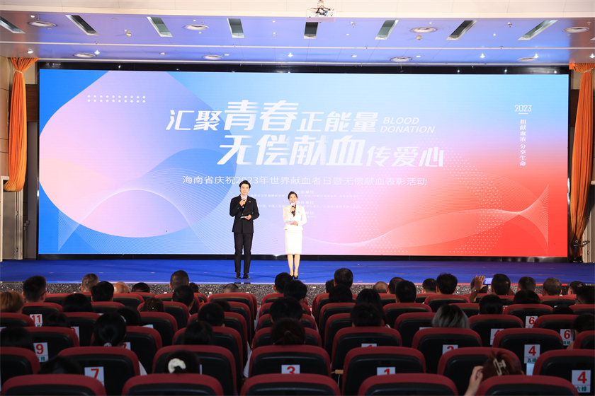 为庆祝第二十个世界献血者日,6月14日,由海南省卫生健康委员会、海南省红十字会、共青团海南省委、海南省教育厅主办,海南医学院、中国人民解放军联勤保障部队第九二八医院(解放军海口血站)协办,海南省血液中心承办的“捐献血液,分享生命”——海南省庆祝2023年世界献血者日暨无偿献血表彰活动在海南医学院内隆重举行。