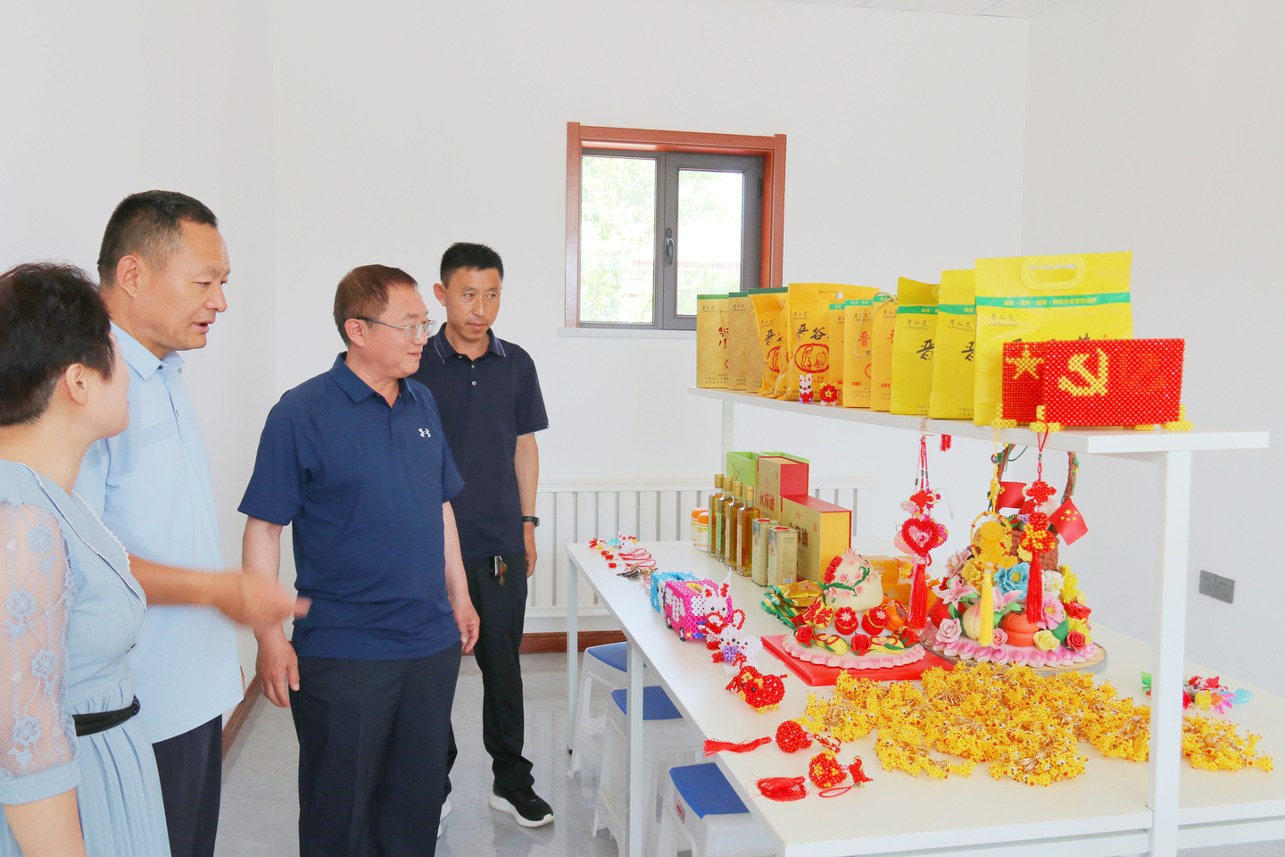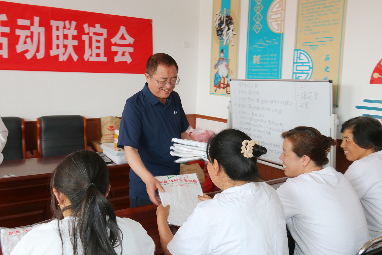 白林书记与杜交曲镇相关领导、村委会负责人及驻村干部进行了亲切的座谈,详细询问了乡村振兴产业项目发展、政策落实及群众生活收入等情况,深入了解了驻村工作队的驻村履职情况。会上,血液中心驻村第一书记吴梅汇报驻村帮扶工作情况。会后,参观了绣娘馆和电商中心,并向绣娘馆的绣娘们赠送发放血液中心“世界献血者日”文化衫。