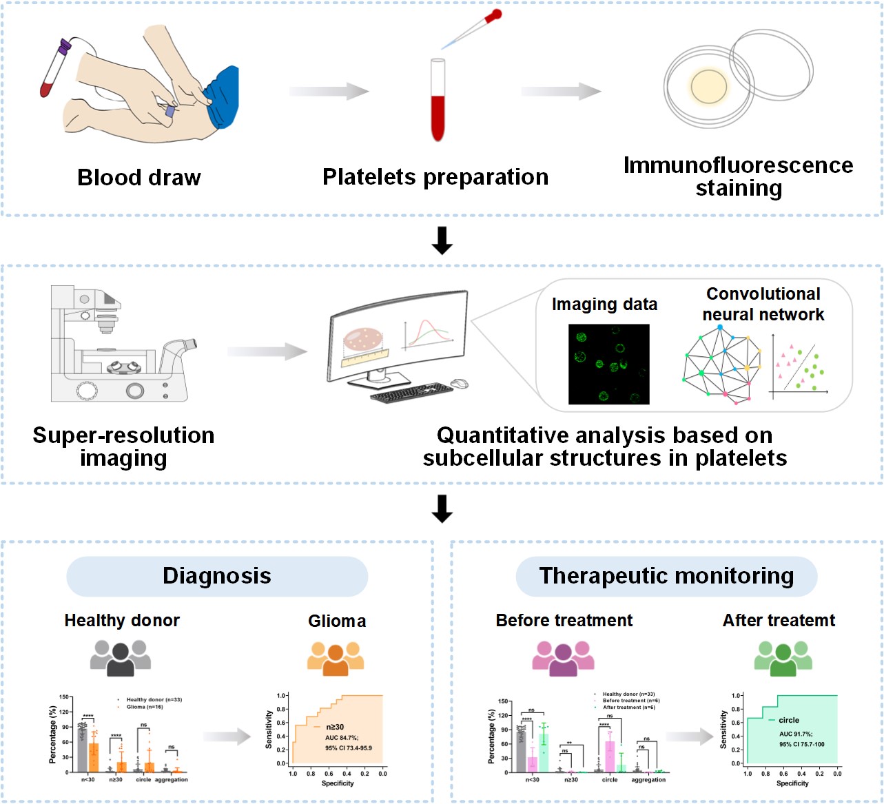 近日,武汉血液中心联合华中科技大学武汉光电国家研究中心在国际上首次提出一种基于血小板亚细胞结构超分辨成像的液体活检新策略。该技术研究基于武汉血液中心与华中科技大学共建的血液光学成像技术中心血小板检测实验平台,并广泛地与医疗机构开展合作。其中,与华中科技大学同济医院合作研究突破性的建立了一种新的肿瘤液体活检方法,成果已在线发表于国际顶尖期刊《Small Methods》(见图1)。研究团队将超分辨荧光显微成像技术、血小板荧光标记技术、智能图像识别与处理技术与肿瘤临床检测相结合,充分发挥多学科交叉融合的优势,为肿瘤液体活检提供了一种全新的亚细胞水平血小板量化检测指标,有望为肿瘤患者的诊疗提供新的突破点。