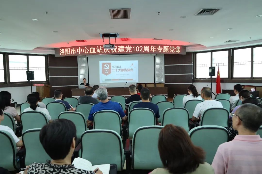 为教育引导党员干部进一步坚定理想信念,弘扬建党精神、赓续红色血脉,洛阳市中心血站召开庆祝建党102周年专题党课,重温誓词,朱丽莉同志带领全体党员学习解读二十大报告要点,进一步激励党员干部职工把思想和行动切实统一到党的二十大精神上来,立足本职岗位,坚持守正创新,把学习宣传贯彻党的二十大精神与采供血事业结合起来,以实际行动持续推进无偿献血事业高质量发展。