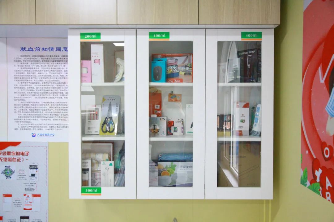 献血屋为献血员提供保温杯、雨伞、体重秤、保鲜盒等多种常规纪念品,还可选择定制公交IC卡,更有网上献血爱心积分兑换送货到家等便民服务。