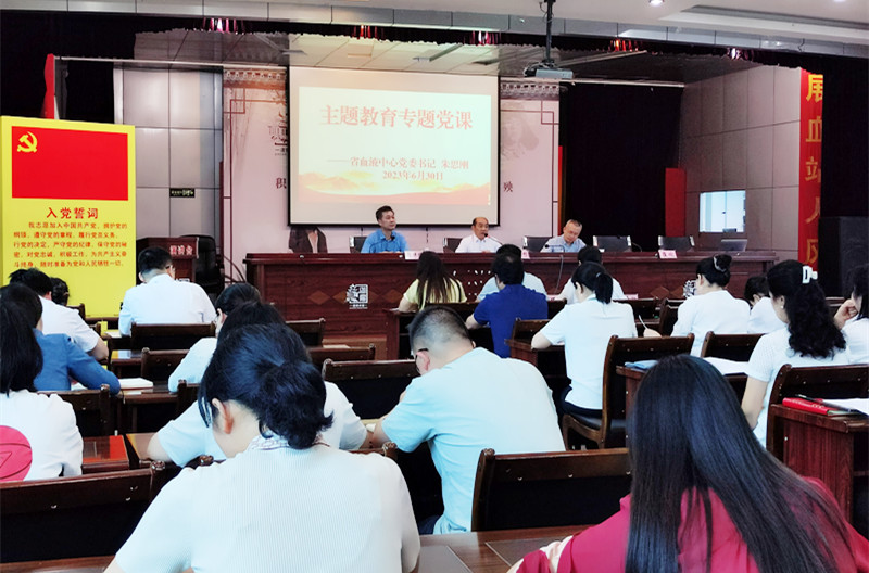 2023年6月30日,省血液中心党委召开庆祝中国共产党成立102周年大会,会上,中心党委书记朱思刚以“学深悟透习近平新时代中国特色社会主义思想,以开展主题教育为契机,树立践行正确政绩观,奋力谱写采供血事业高质量发展新篇章”为题,为全中心党员干部职工讲授主题教育专题党课。省卫生健康委主题教育第二督导组组长廖永芳到会指导。中心领导班子成员出席会议。