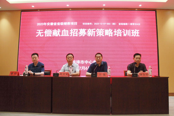 2023年7月5日至7日,蚌埠市中心血站举办省级继续医学教育项目--无偿献血招募新策略培训班。安徽省血液管理中心主任范文安、蚌埠市卫生健康委员会四级调研员王雷、蚌埠市中心血站书记、站长董柱出席开幕式。皖北各血站领导、采供血专业技术人员100余人参加培训。