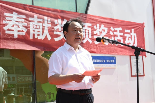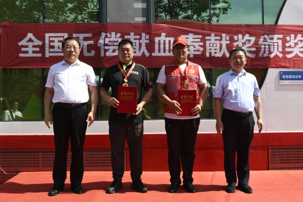 临朐县政府副县长夏树英(左一),潍坊市中心血站党委书记、站长王胜(右一),共同为获奖者代表颁发荣誉证书及奖章.