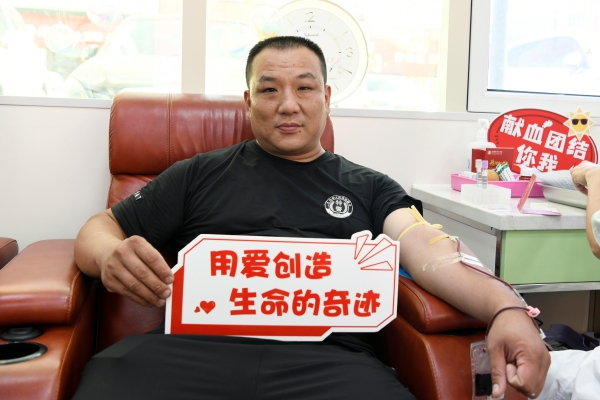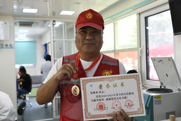 “您请坐……我为您缠上绷带……请慢走……”,活动当天,张继业带着志愿者和获奖者的双重身份来到献血屋。作为一名志愿者,他早上不到7点就来到献血屋,布置现场、服务献血者、协助采血工作,张继业身上仿佛有使不完的力量,纵使汗水涔涔,但真诚热情的笑容却一直挂在脸上。作为一名获奖者,张继业当天领取了“全国无偿献血奉献奖”银奖证书。他从1999年开始接触无偿献血,二十多年来坚持献血从不间断,到目前已累计献血46次,献血量达到1.7万毫升,是当之无愧的献血英雄。